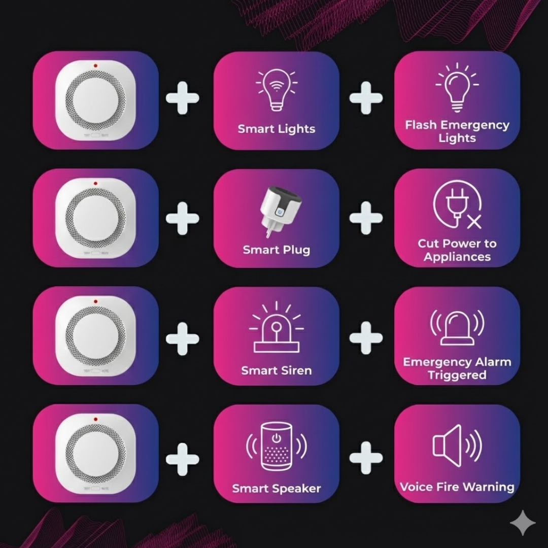 • Triggers smart lights to flash as a visual smoke alarm.