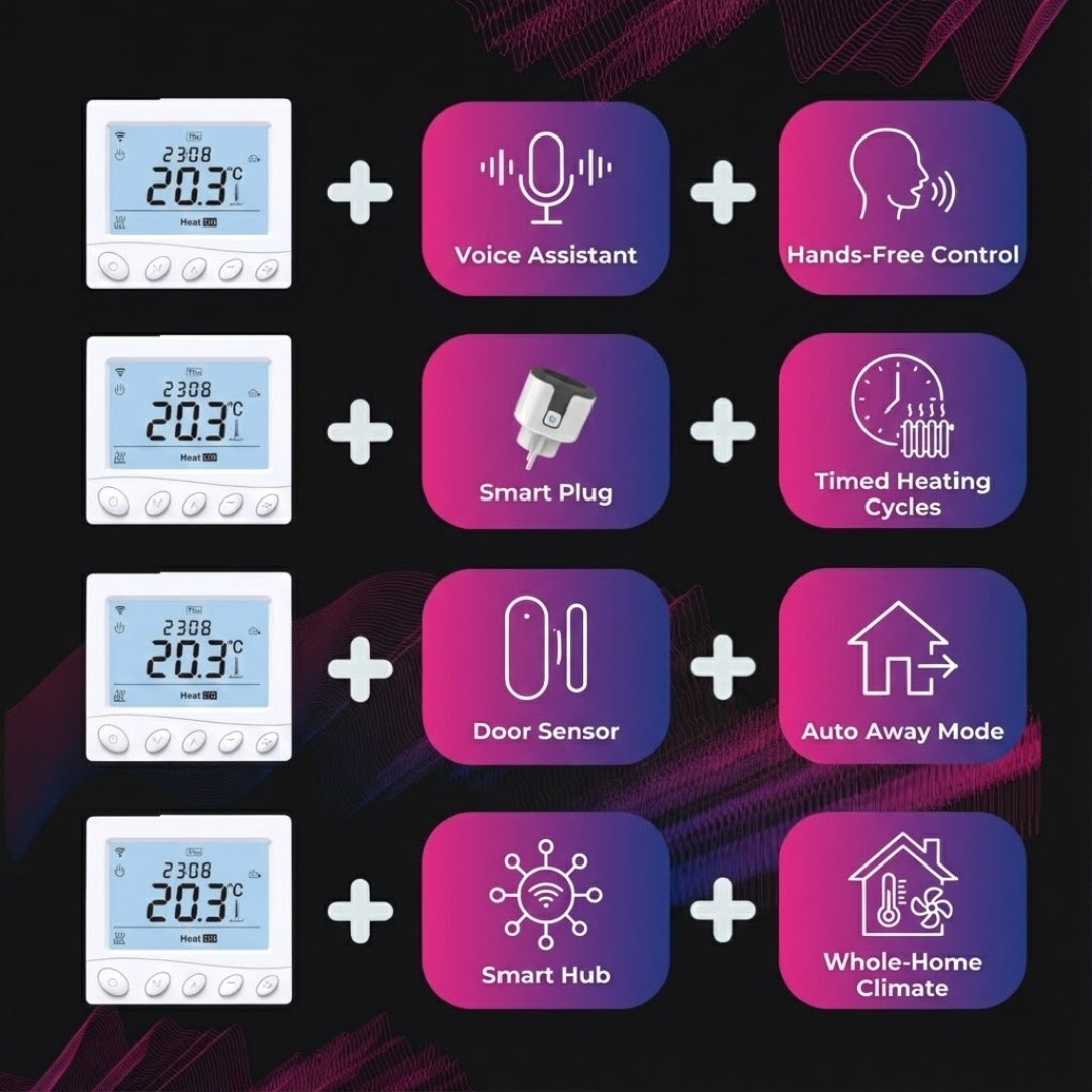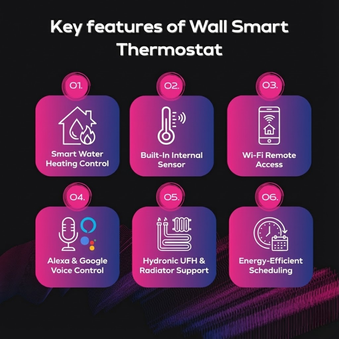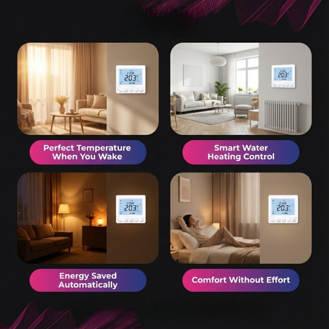 Compatible with hydronic underfloor heating and radiator systems, this thermostat precisely controls your water-based heating to maintain consistent, comfortable temperatures in every room.