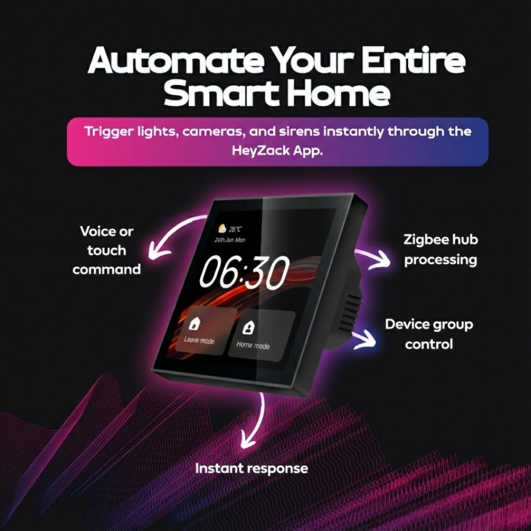 Control lights, locks, climate, and scenes from anywhere with the HeyZack Smart Control app — free on iOS and Android.