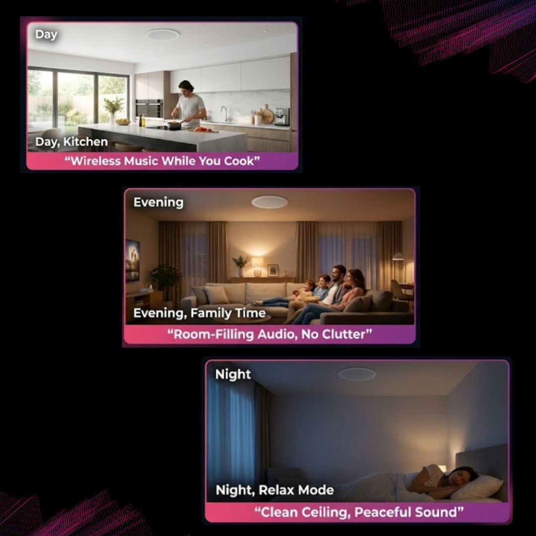 • Evening routine lowers amplifier to 10W for gentle 50Hz background bass while cooking dinner in kitchen zone.