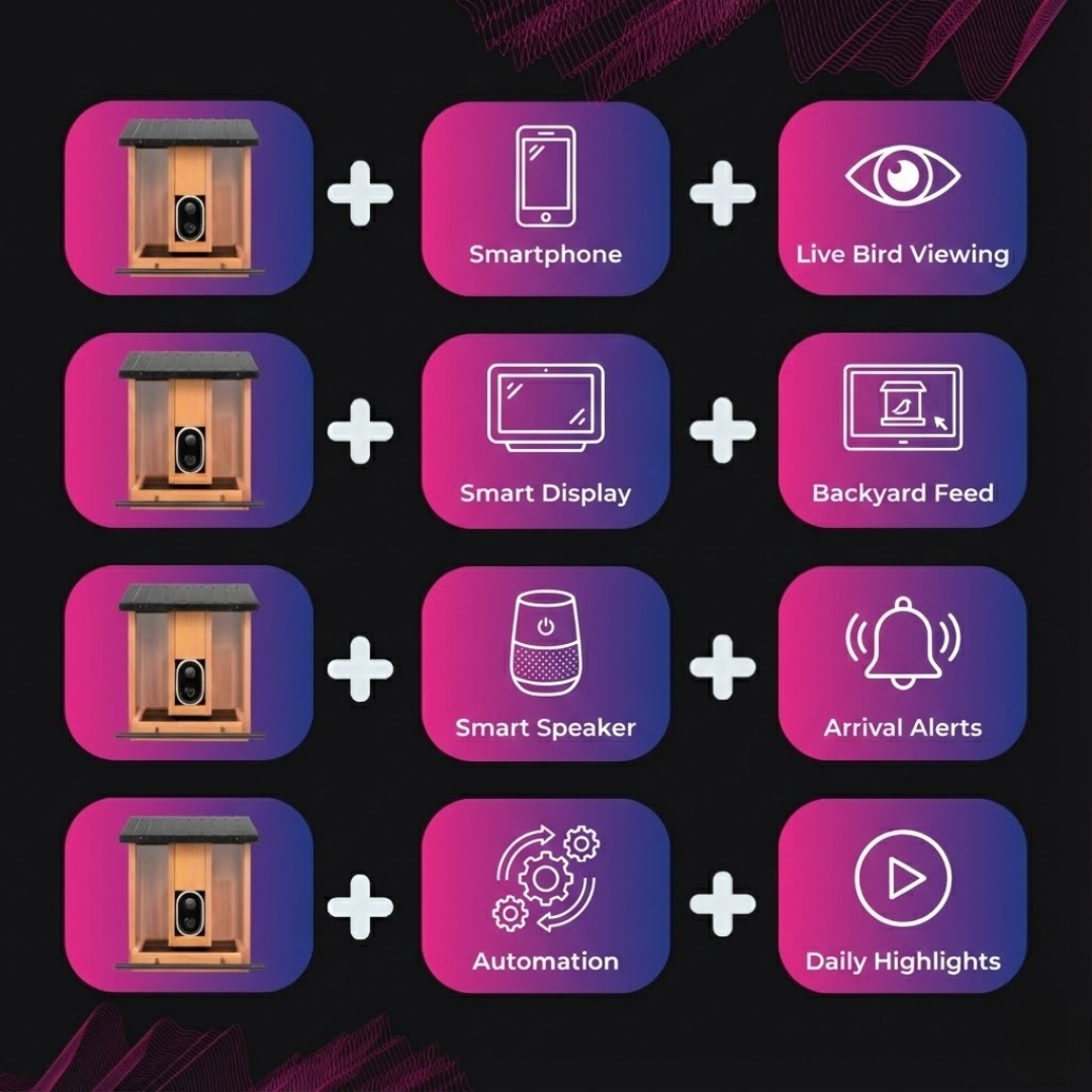 The Smart bird feeder works seamlessly with smart speakers and mobile devices. Check your backyard visitors using voice assistants or smart displays from anywhere in your home.