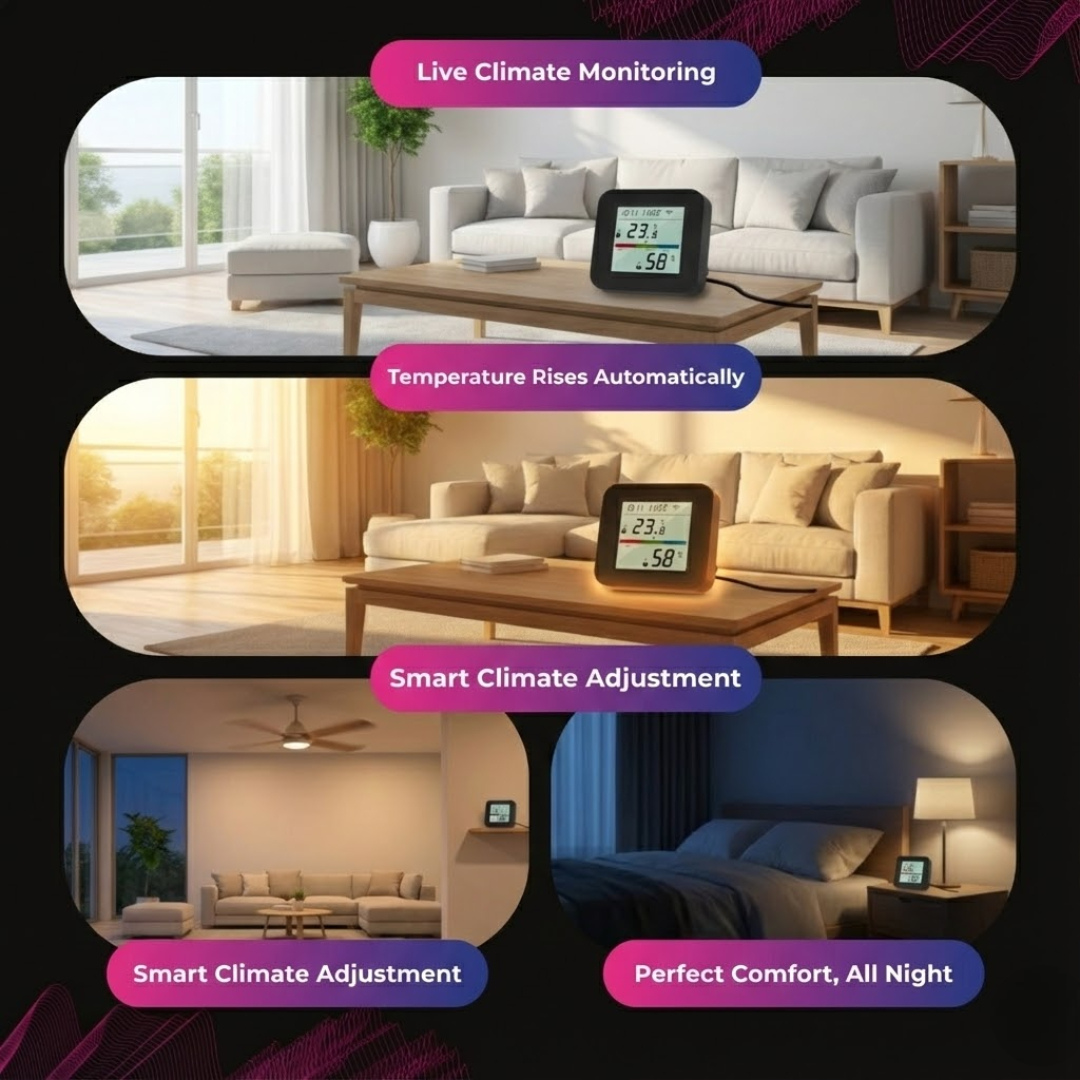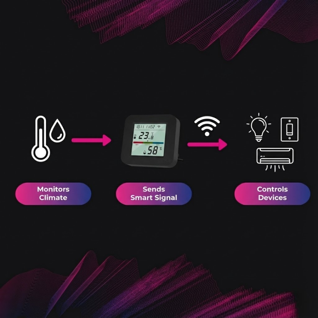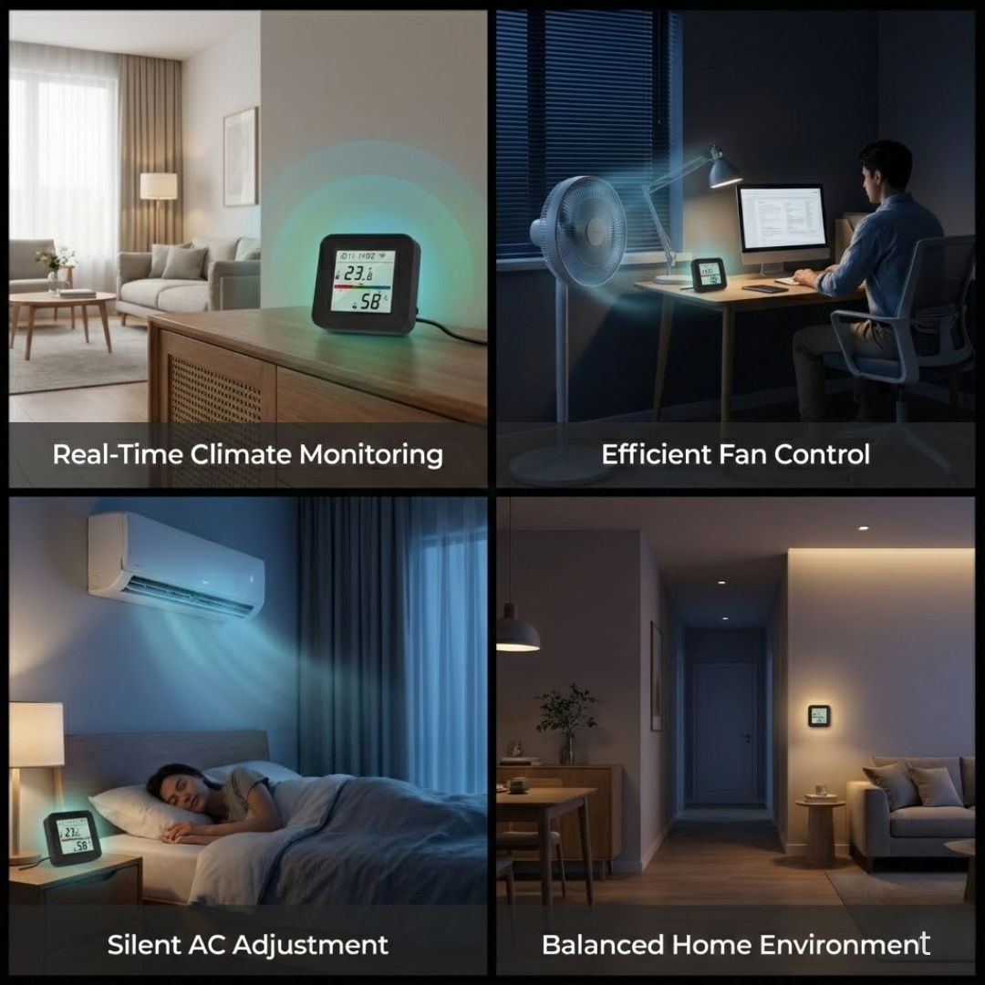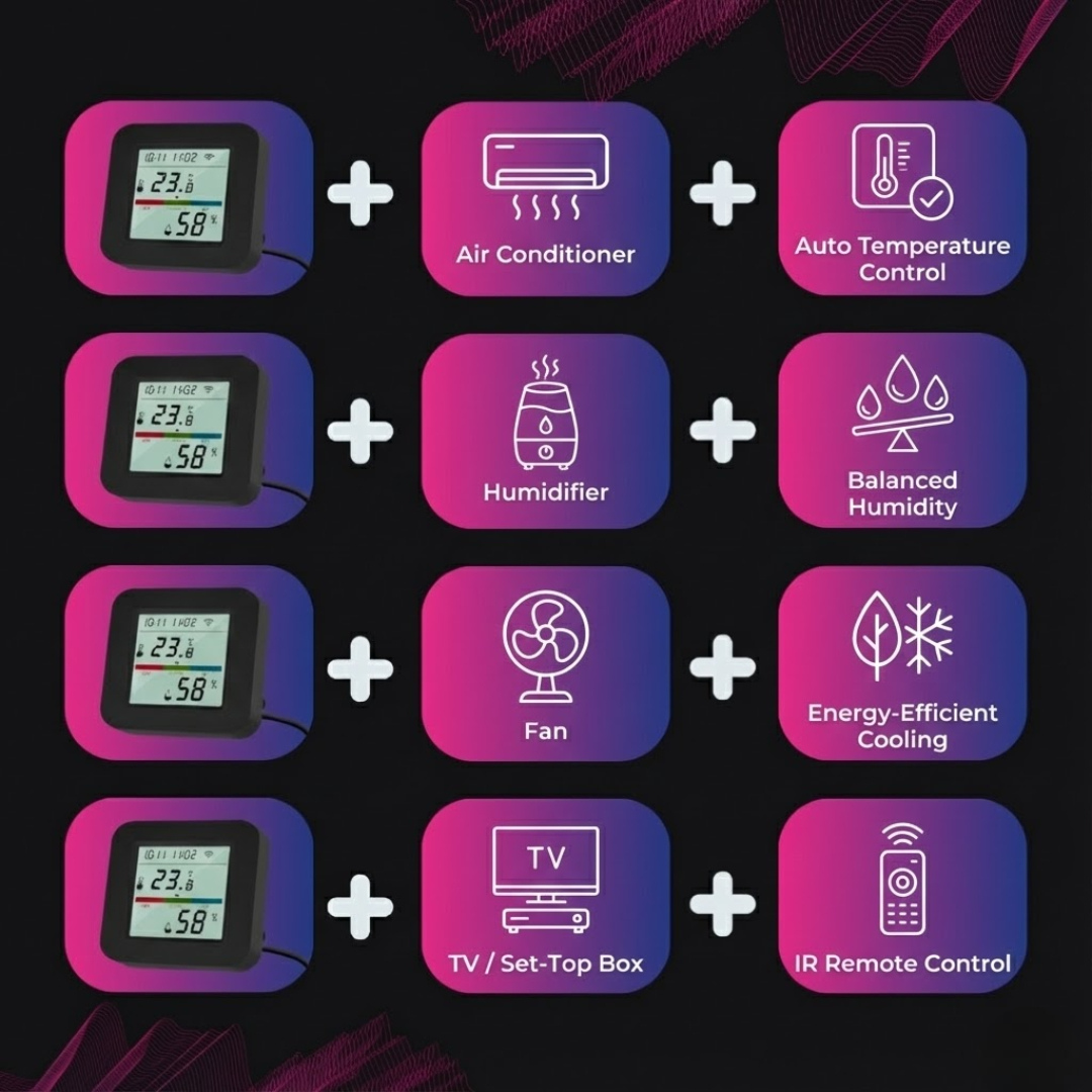 • Automate fans, heaters, and humidifiers via invisible IR signals.