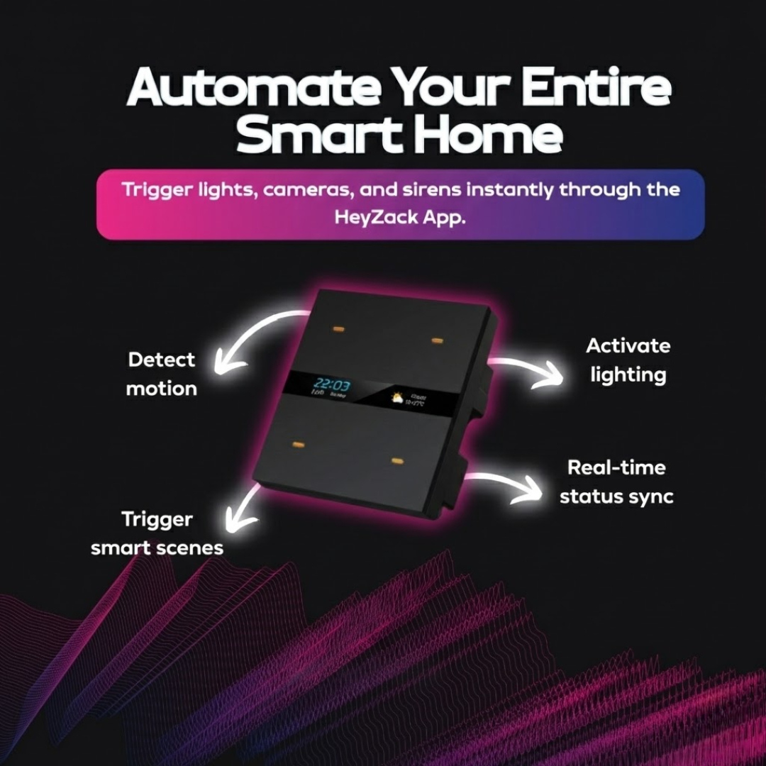 Control lights, locks, climate, and scenes from anywhere with the HeyZack Smart Control app — free on iOS and Android.