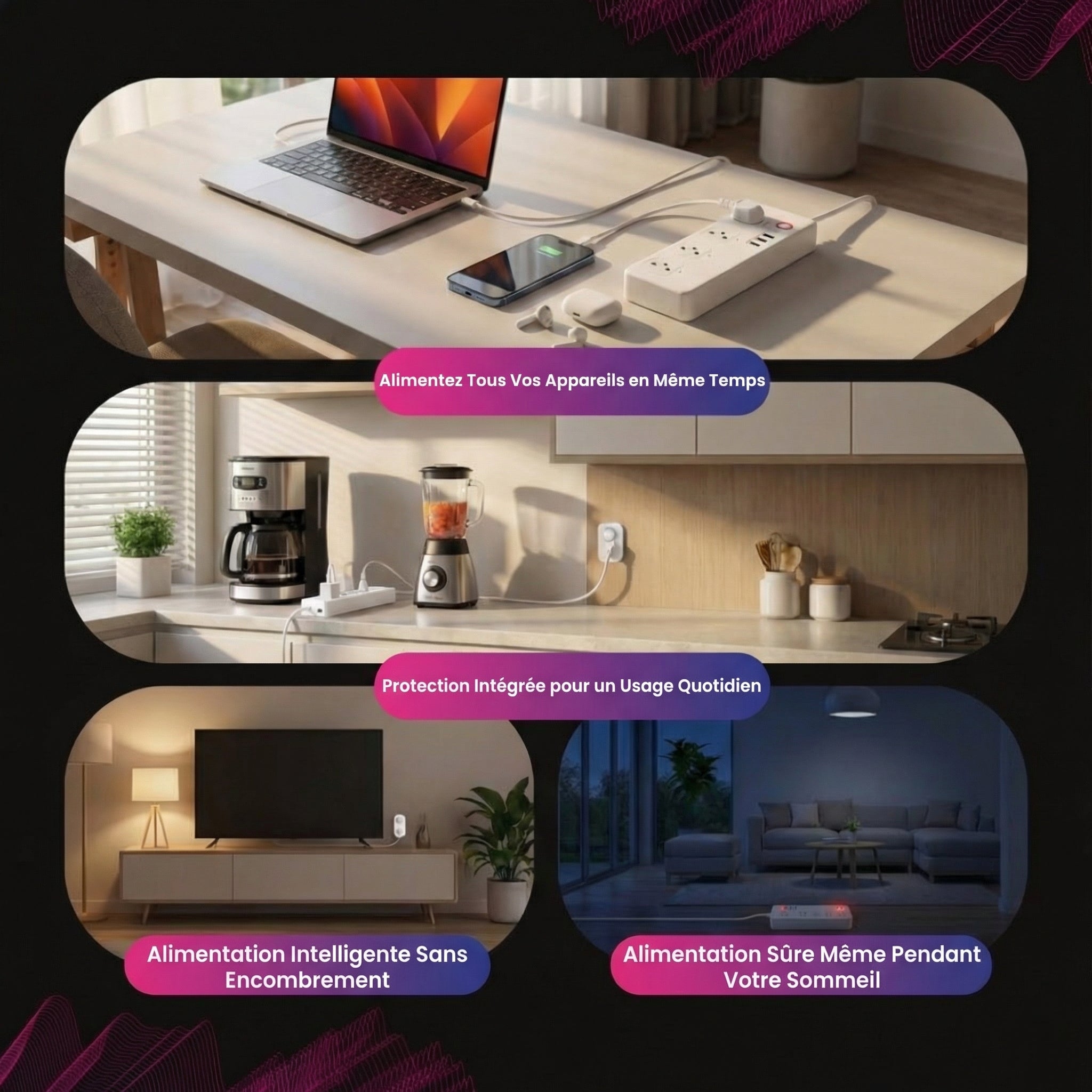 • La protection intégrée contre les surtensions protège les appareils électroniques coûteux contre les pics de tension inattendus.