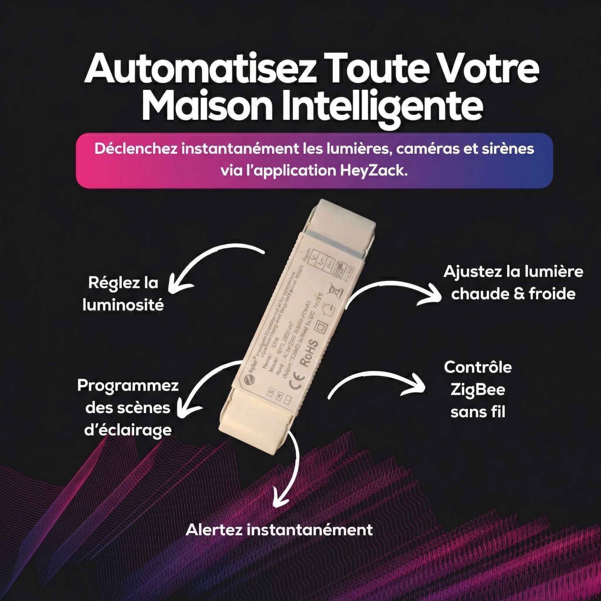 Contrôlez l'éclairage, les serrures, la climatisation et les scénarios depuis n'importe où grâce à l'application HeyZack Smart Control — gratuite sur iOS et Android.
