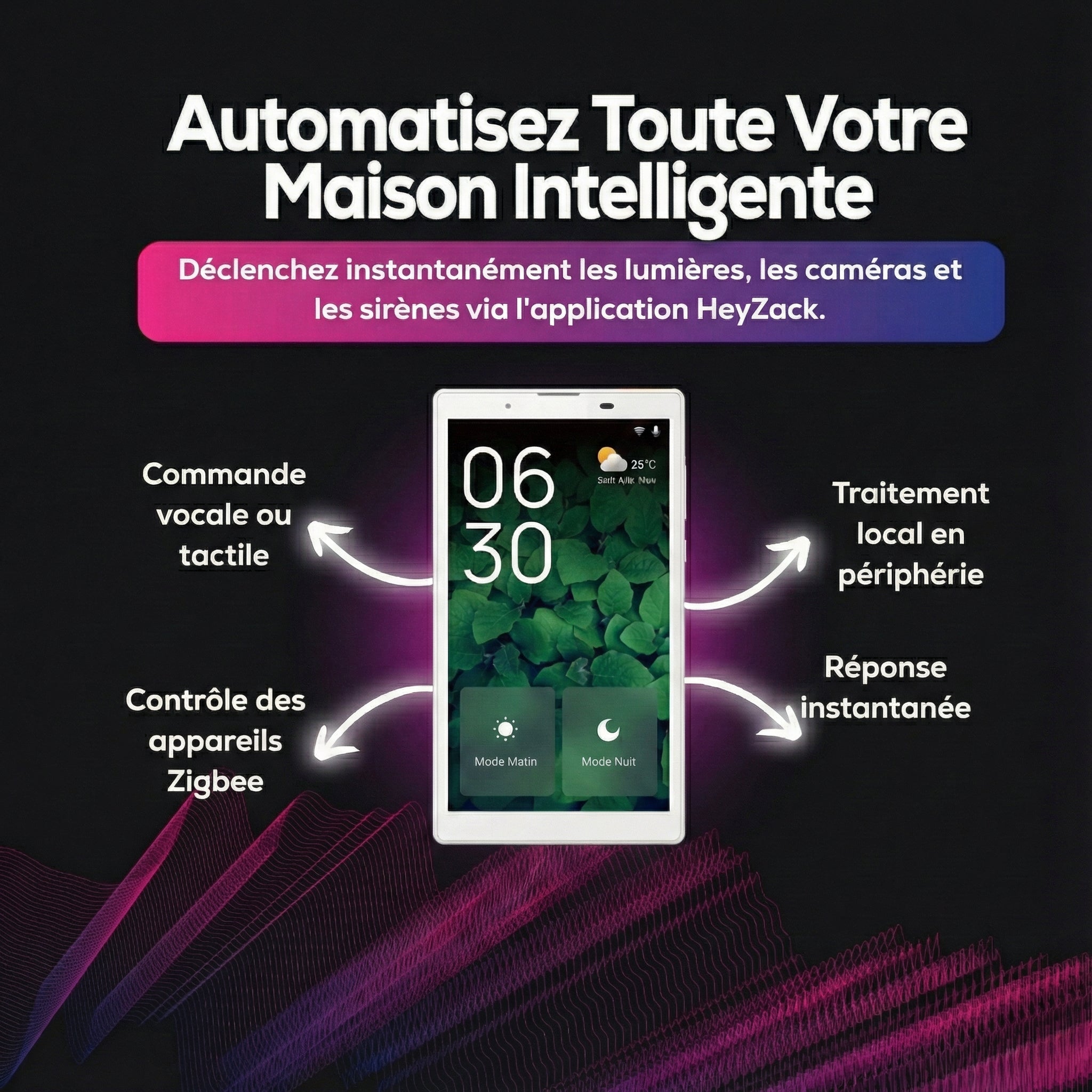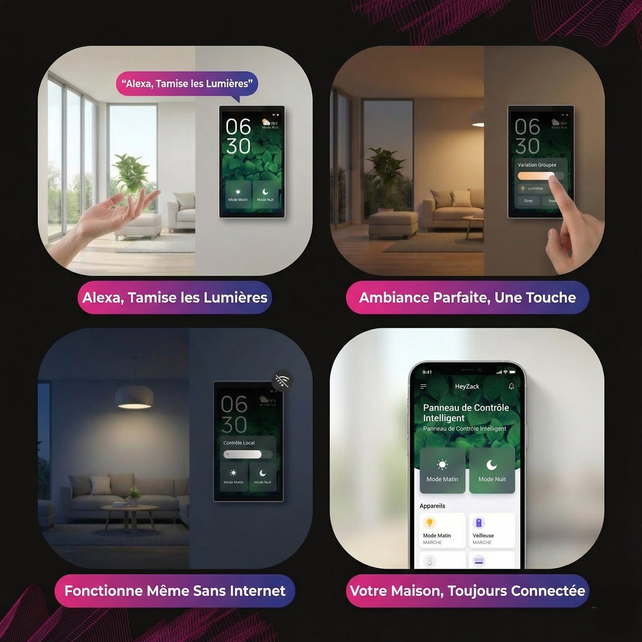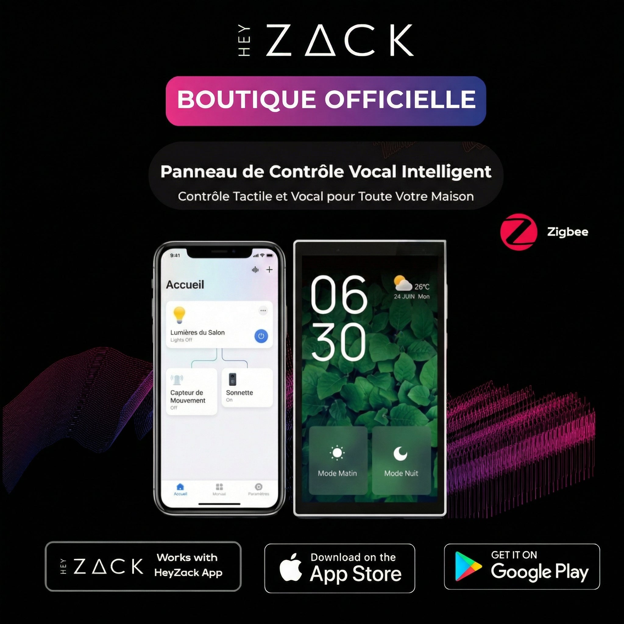 Contrôlez l'éclairage, les serrures, la climatisation et les scénarios depuis n'importe où grâce à l'application HeyZack Smart Control — gratuite sur iOS et Android.