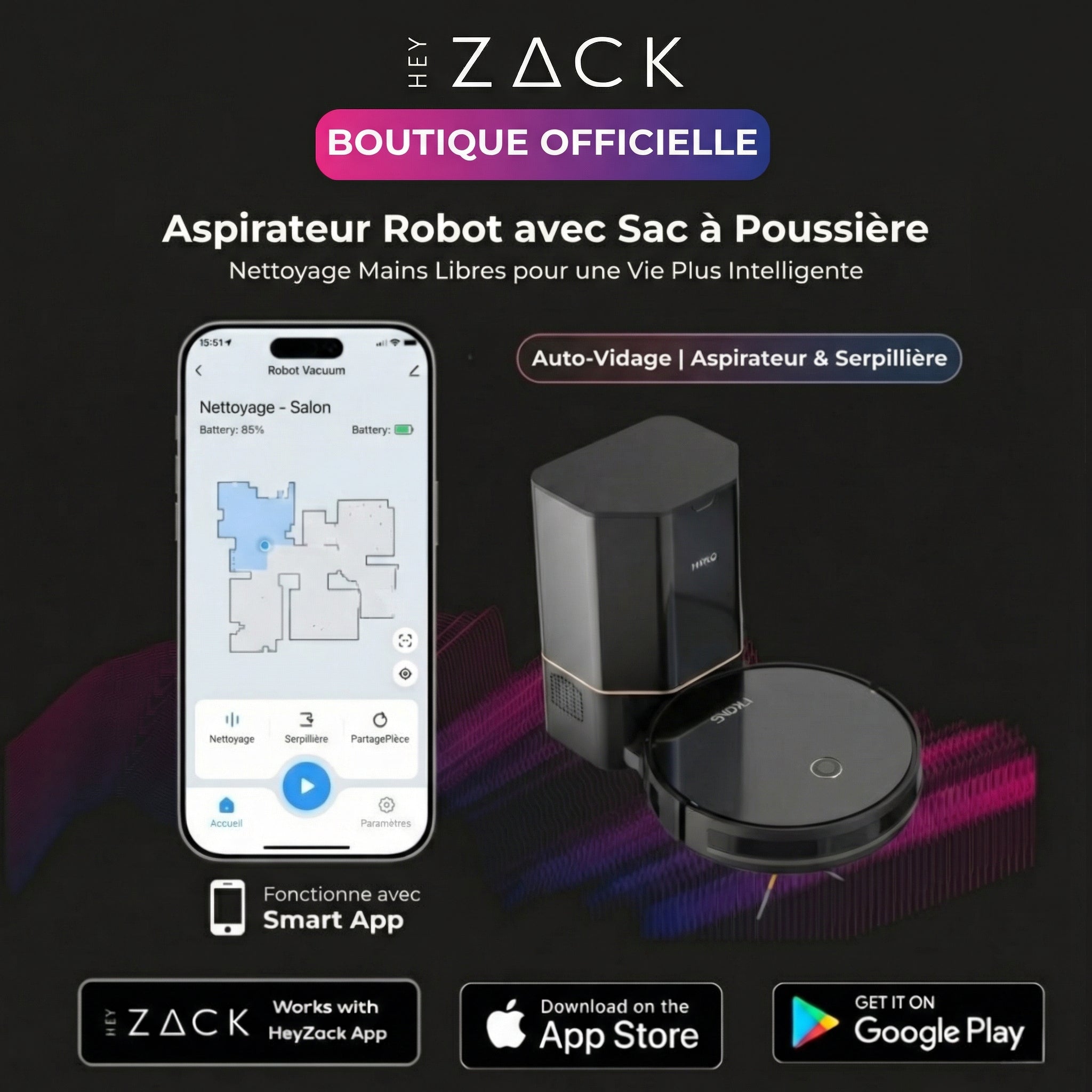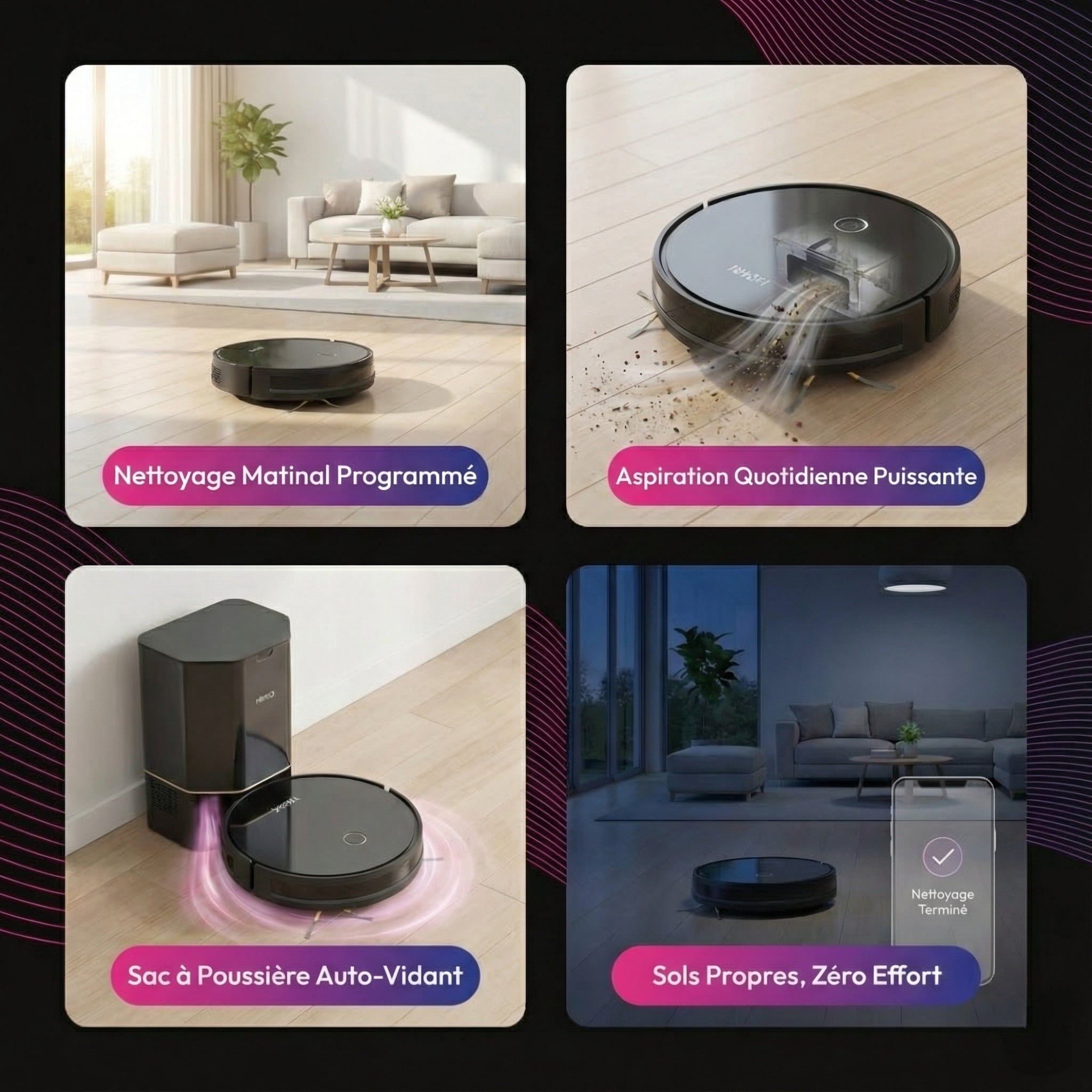 Des sols propres, ça se fait tout seul. Cet aspirateur robot avec sac à poussière se vide tout seul, vous n'avez plus à vous en soucier.