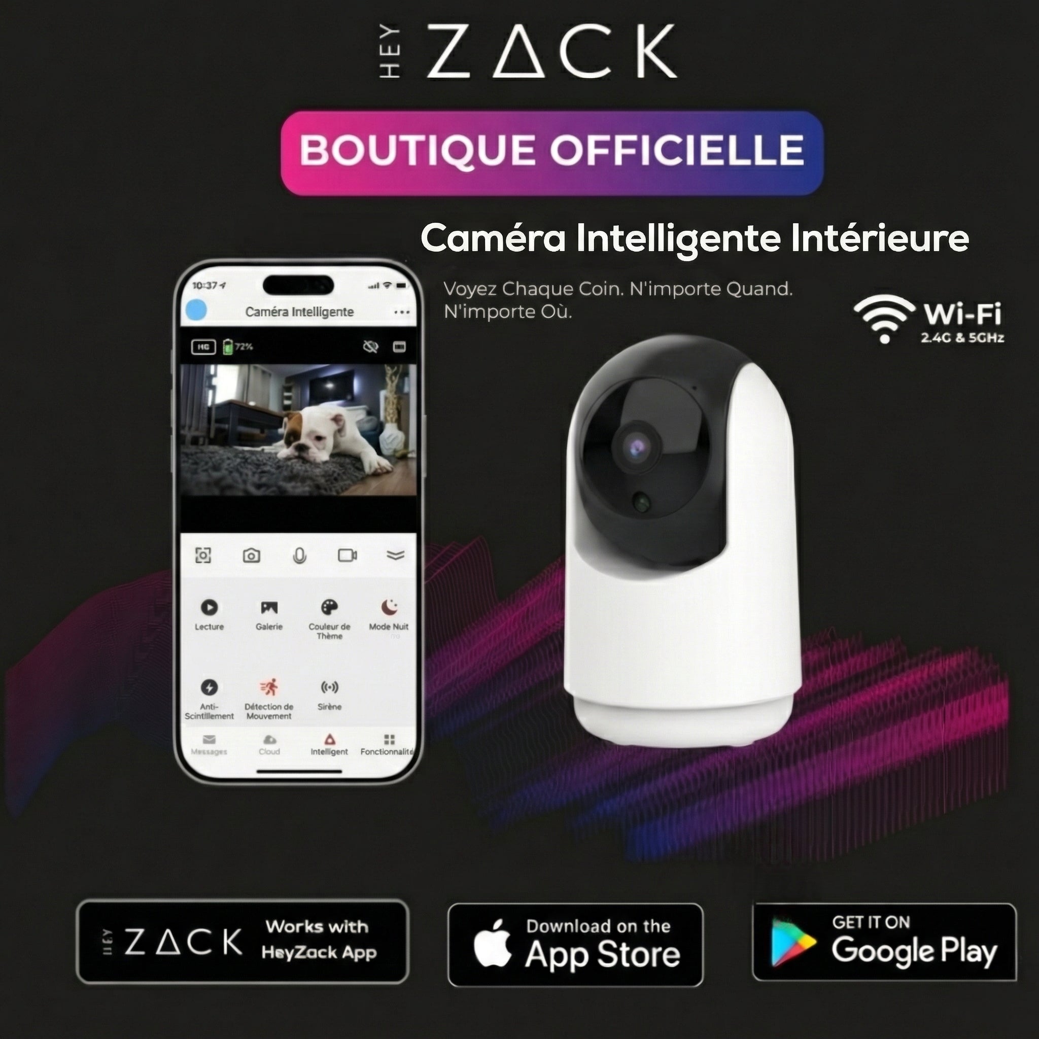 Contrôlez l'éclairage, les serrures, la climatisation et les scénarios depuis n'importe où grâce à l'application HeyZack Smart Control — gratuite sur iOS et Android.