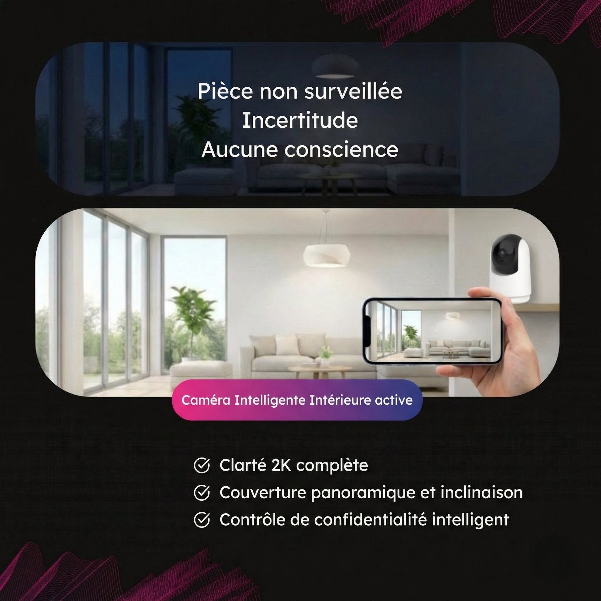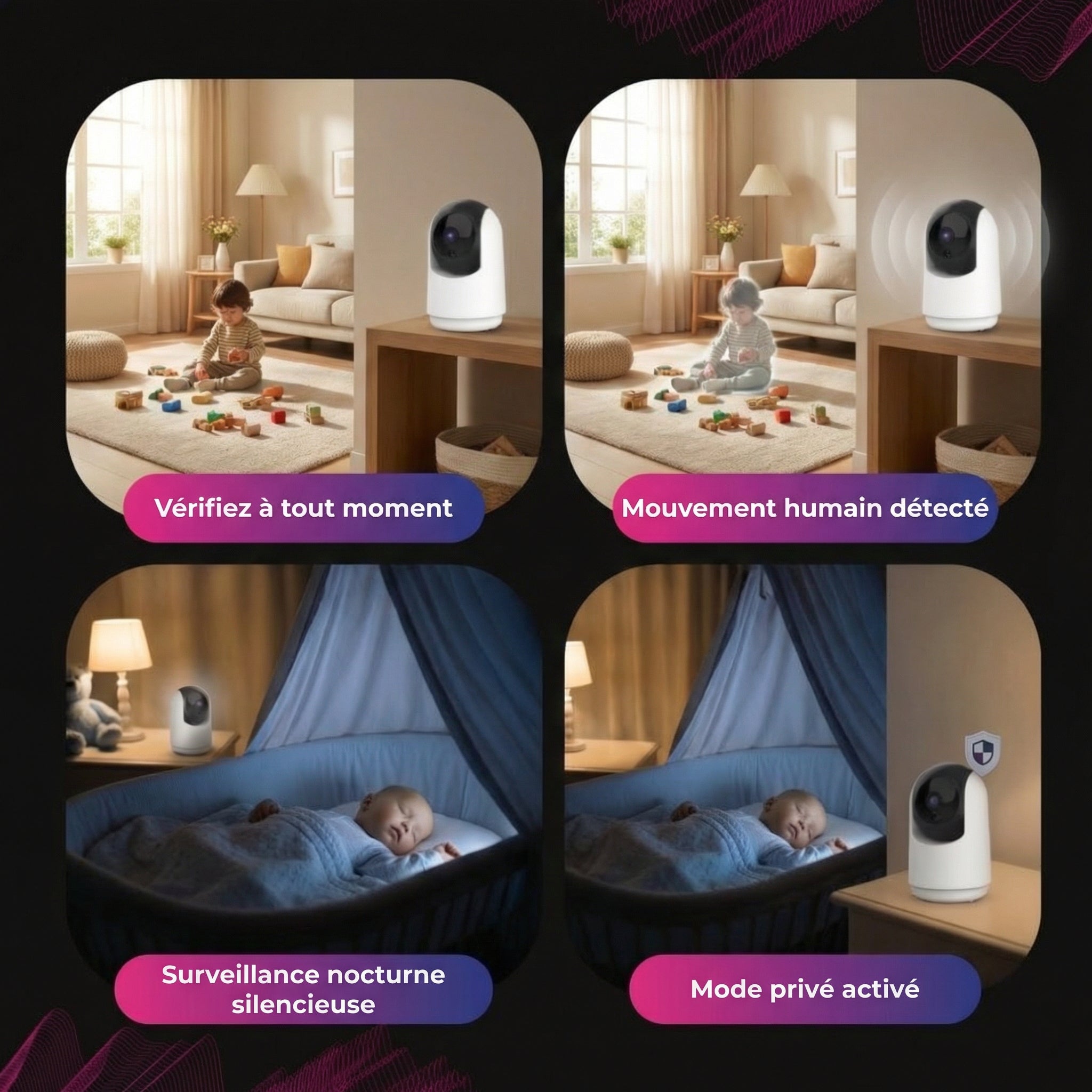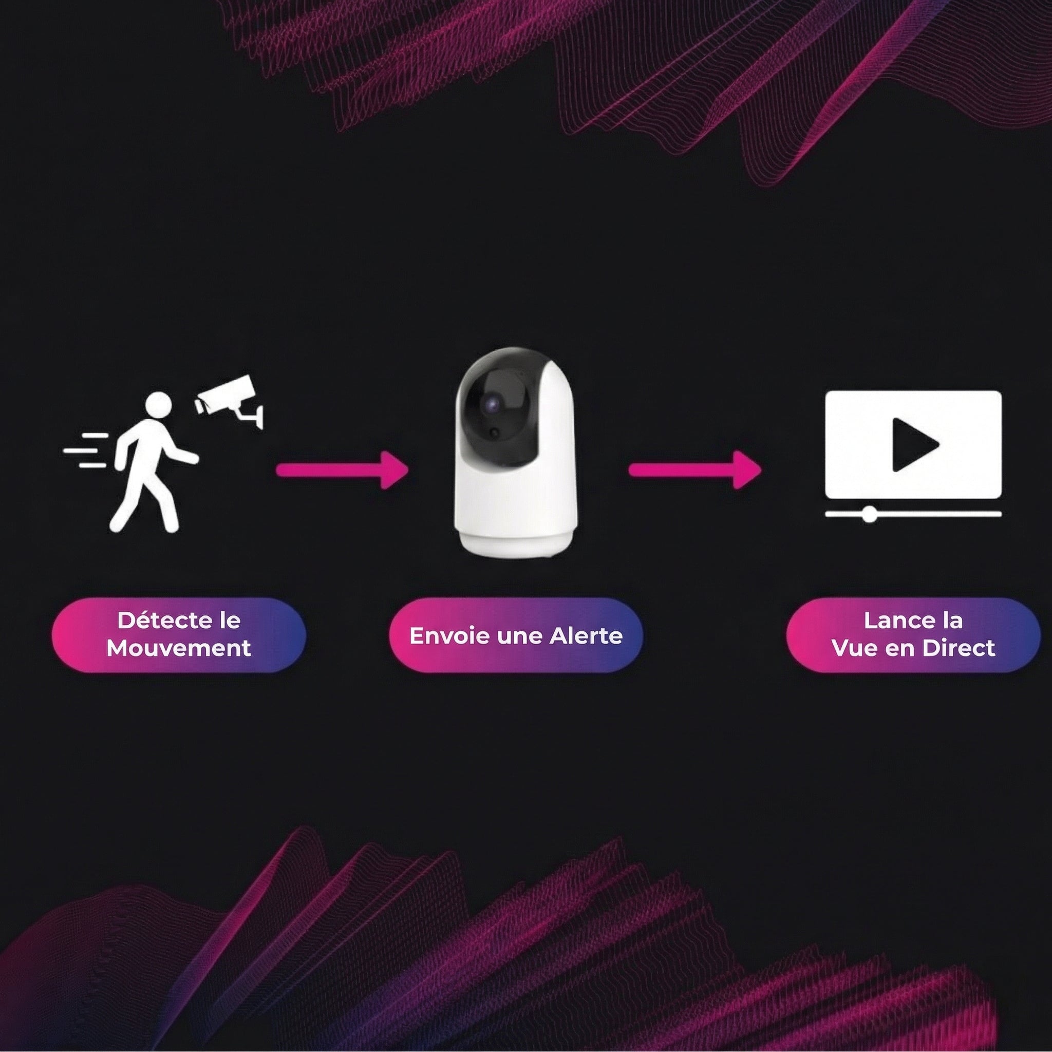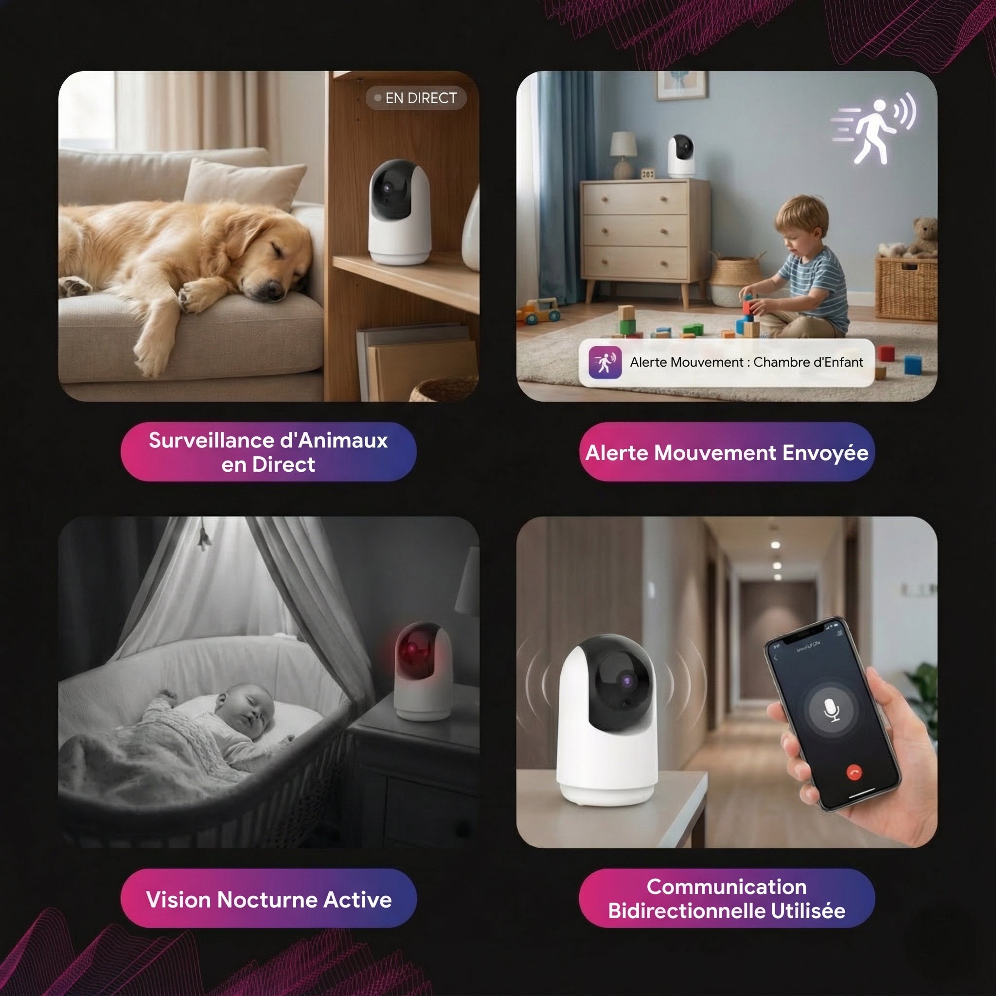 • Les alertes de mouvement vous envoient une notification sur votre téléphone dès qu'un mouvement se produit, transformant ainsi les surprises en certitudes.
