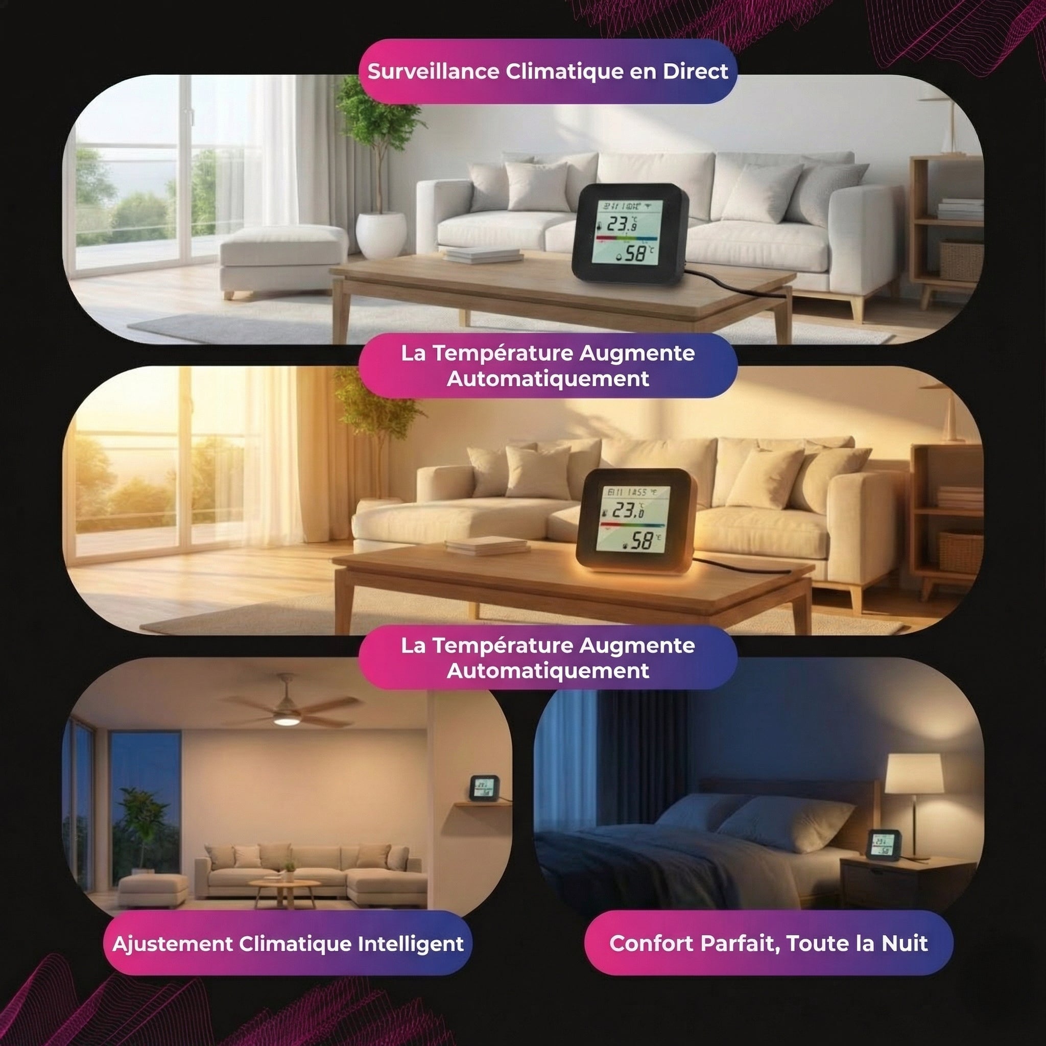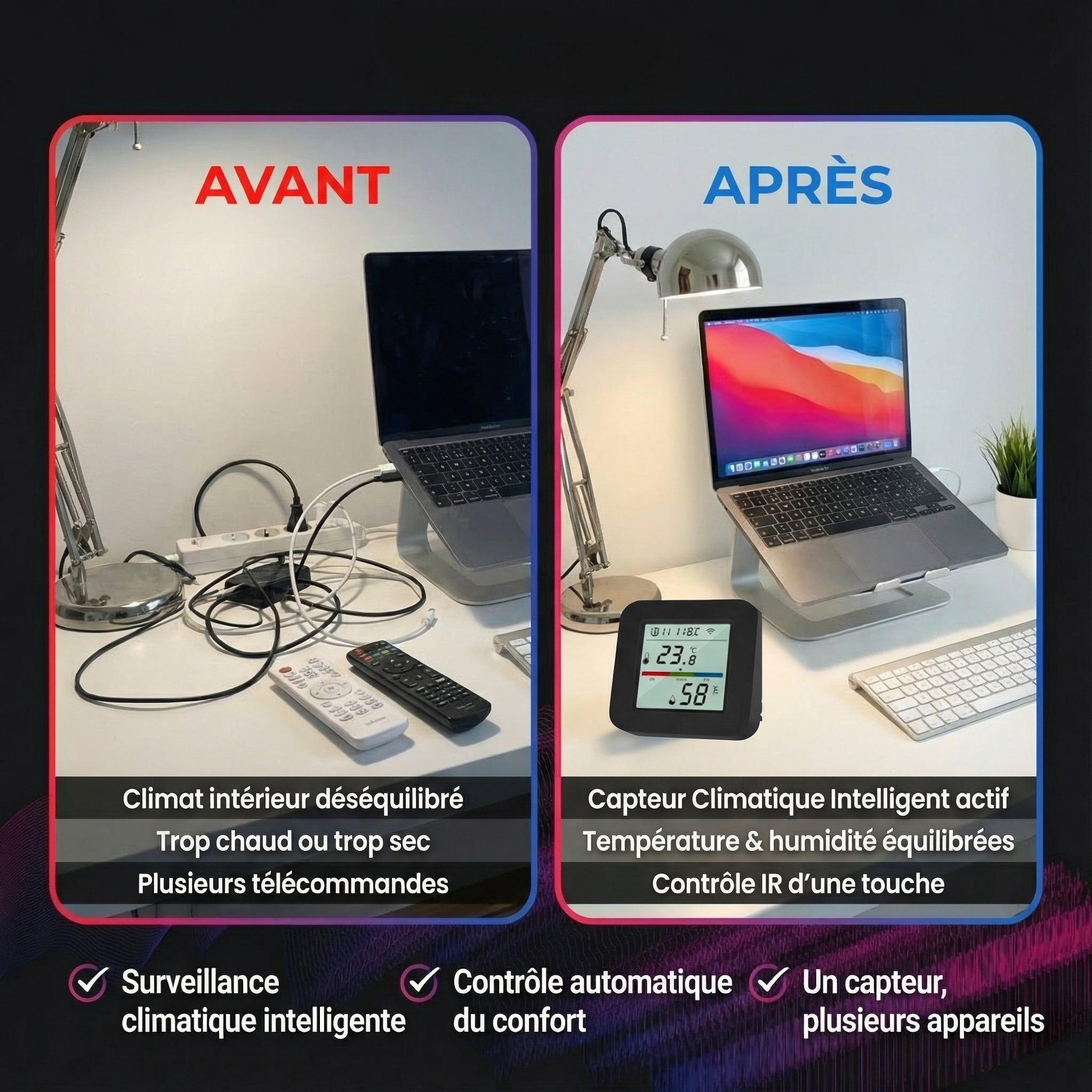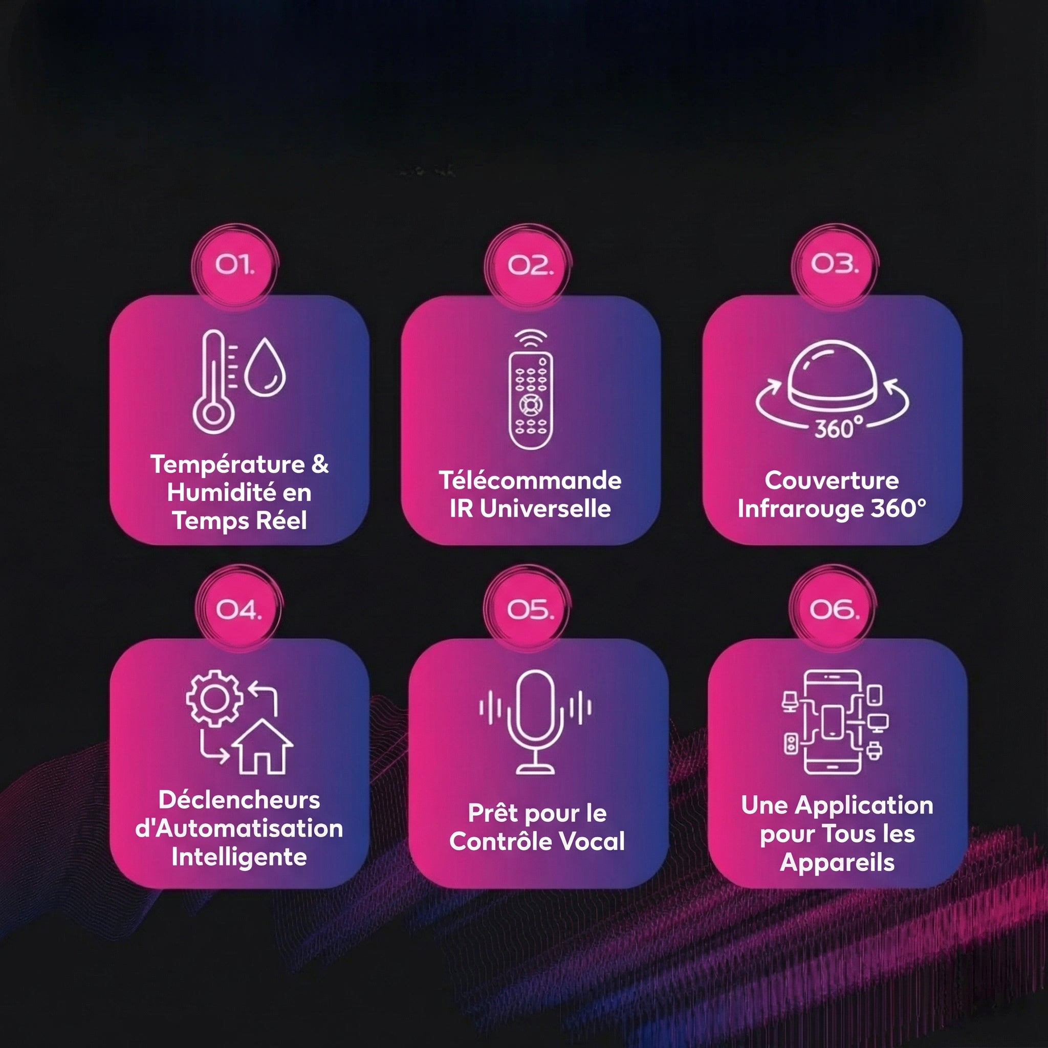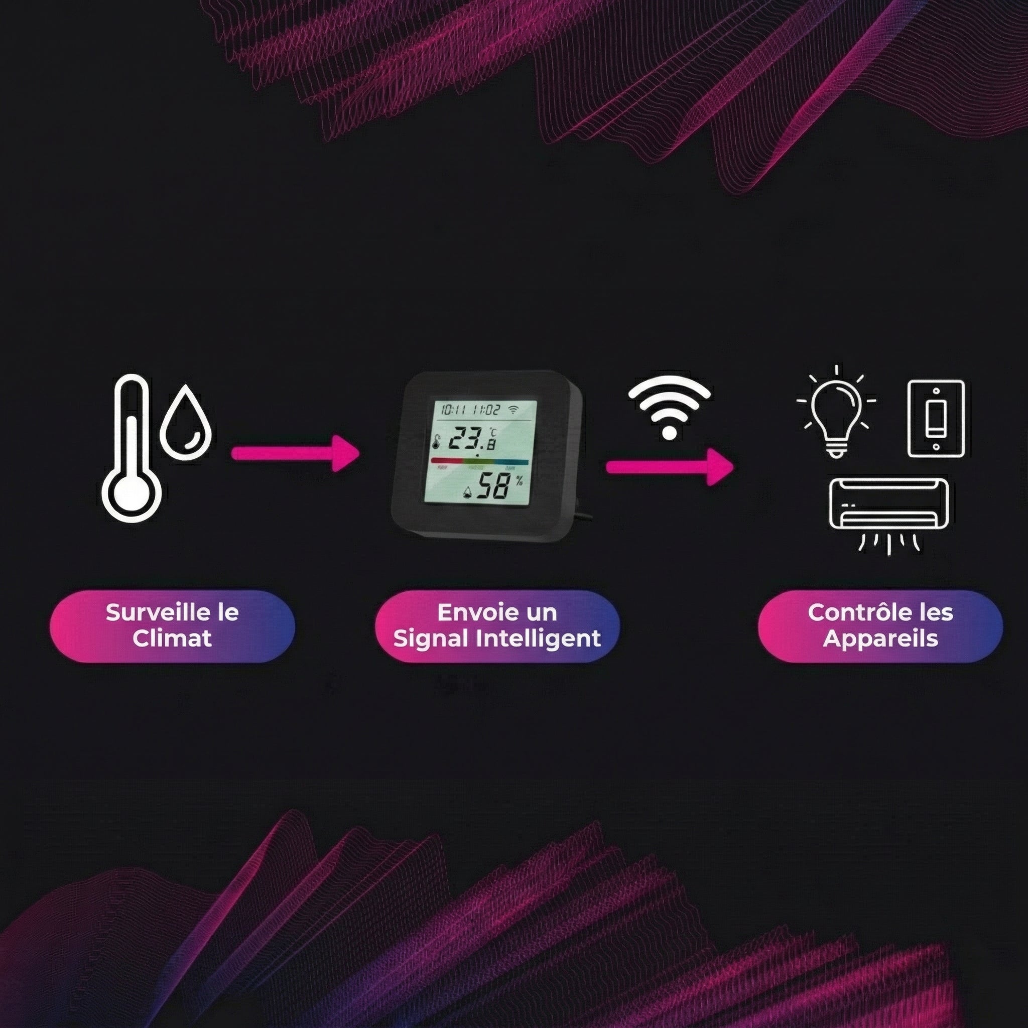 • Automatisez les ventilateurs, les radiateurs et les humidificateurs grâce à des signaux infrarouges invisibles.
