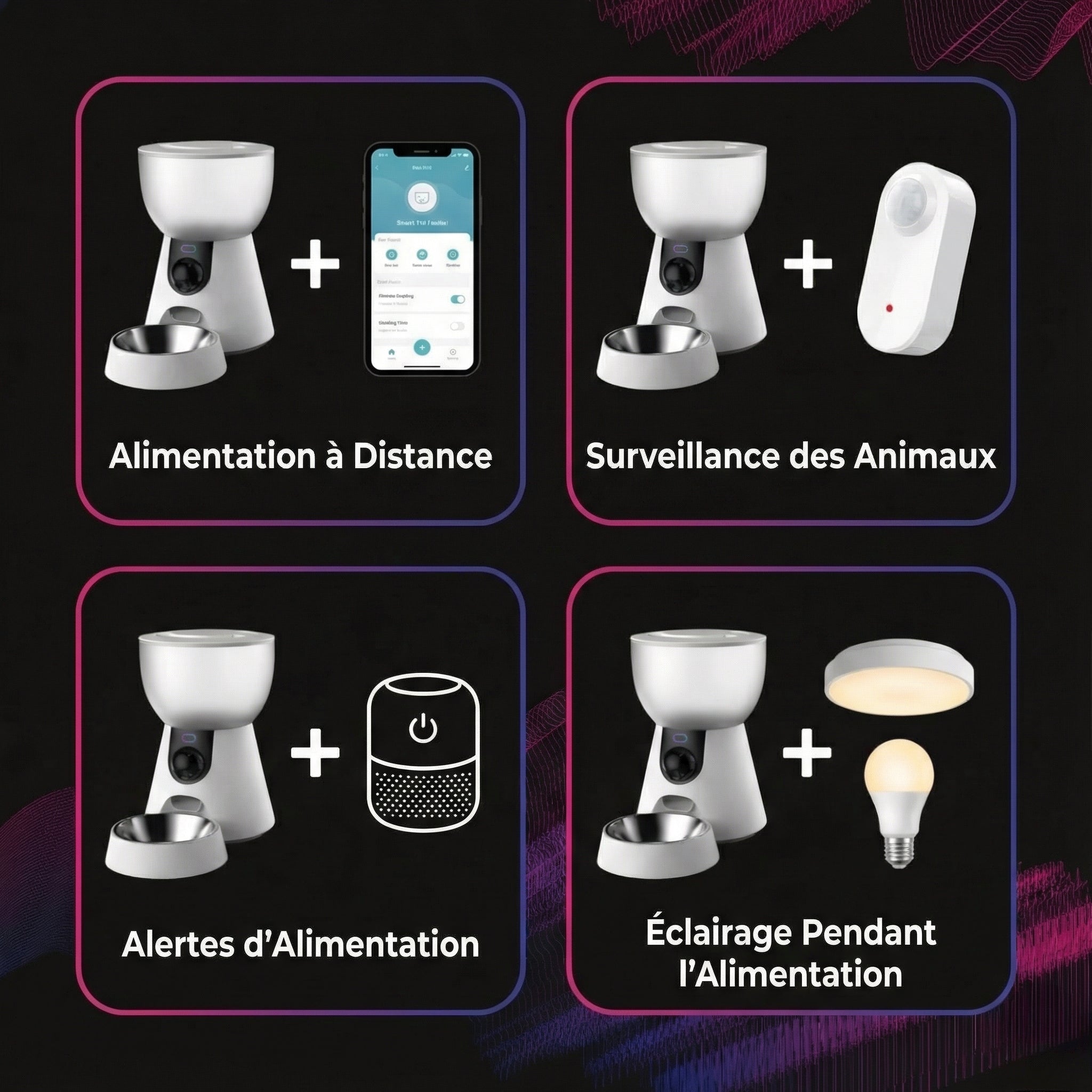 • Enregistrez votre voix pour appeler vos animaux de compagnie à l'heure du repas, dans un confort familier.