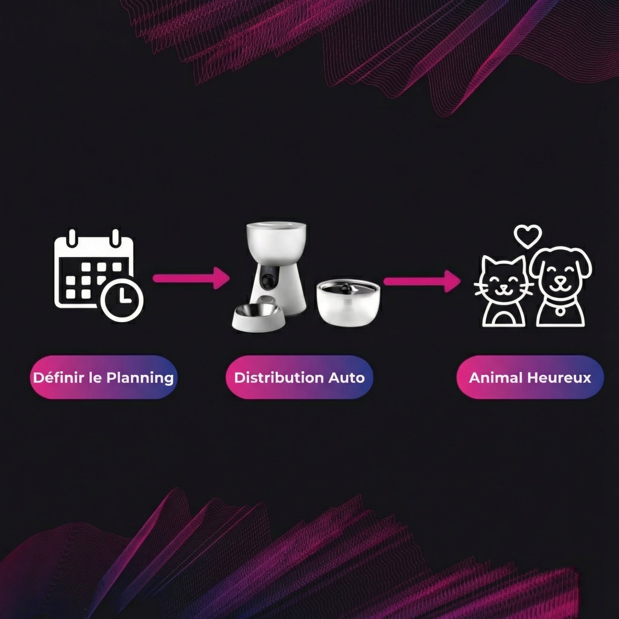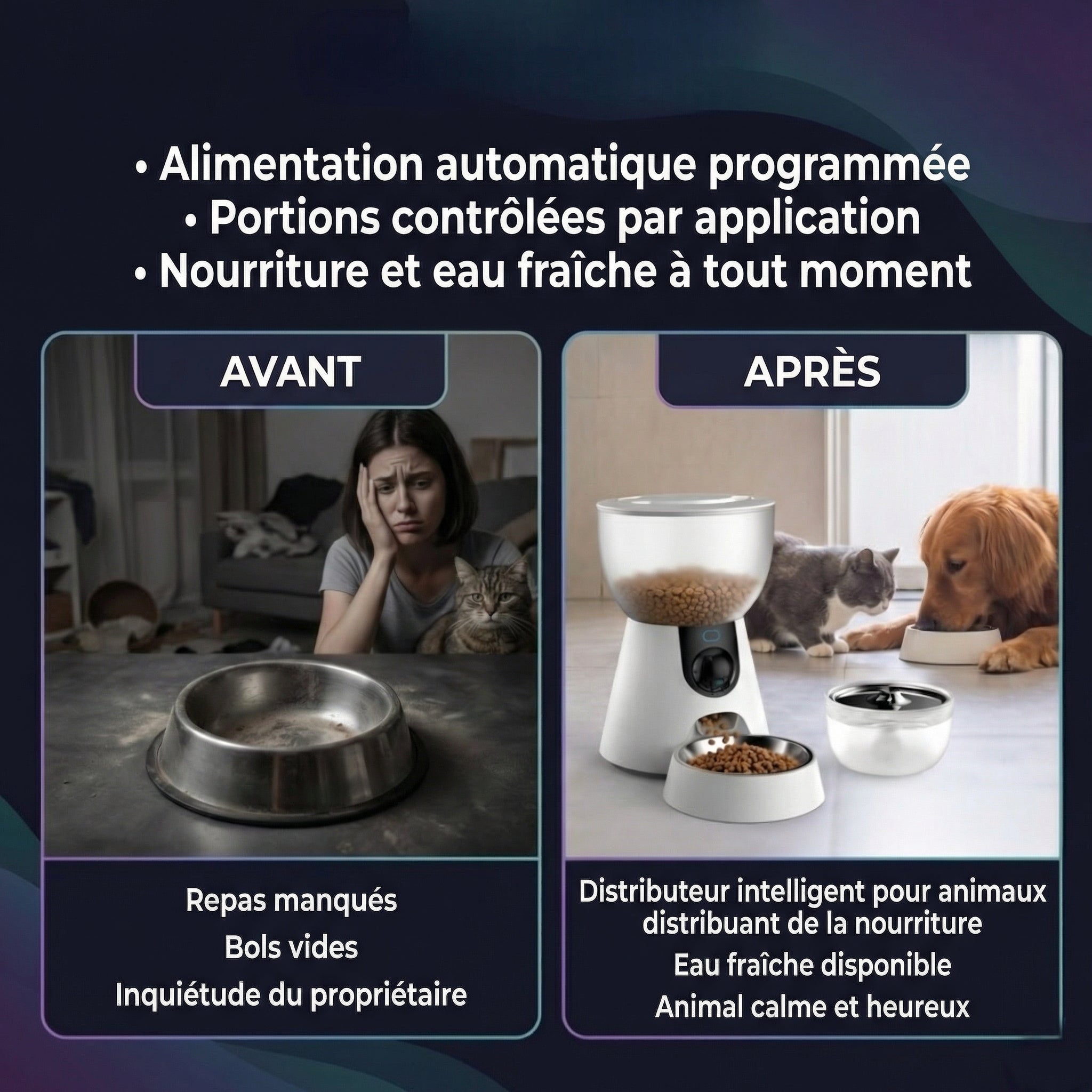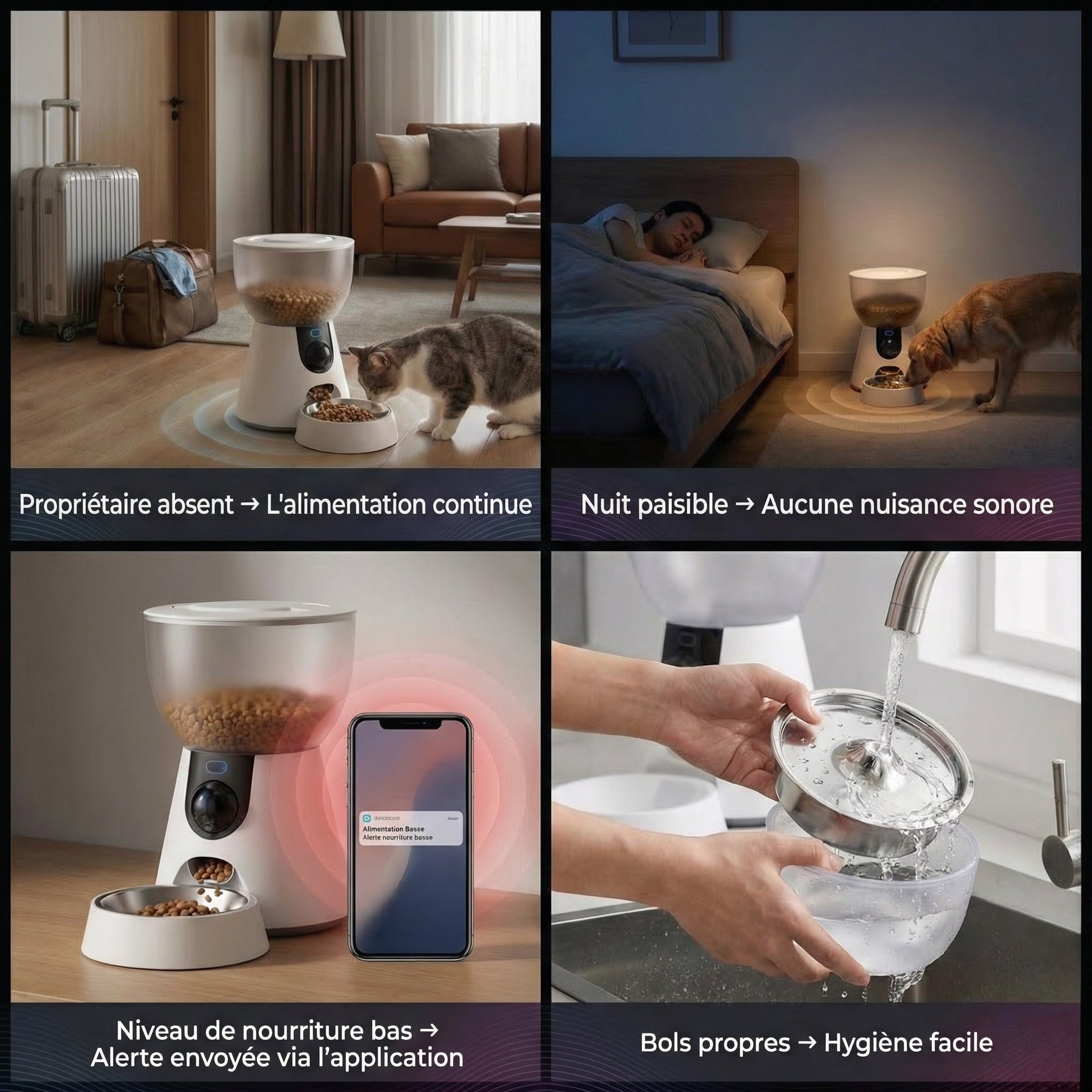 Nourrissez votre animal à heures fixes, même si la vie vous en empêche. Plus jamais besoin de vous précipiter à la maison pour dîner.