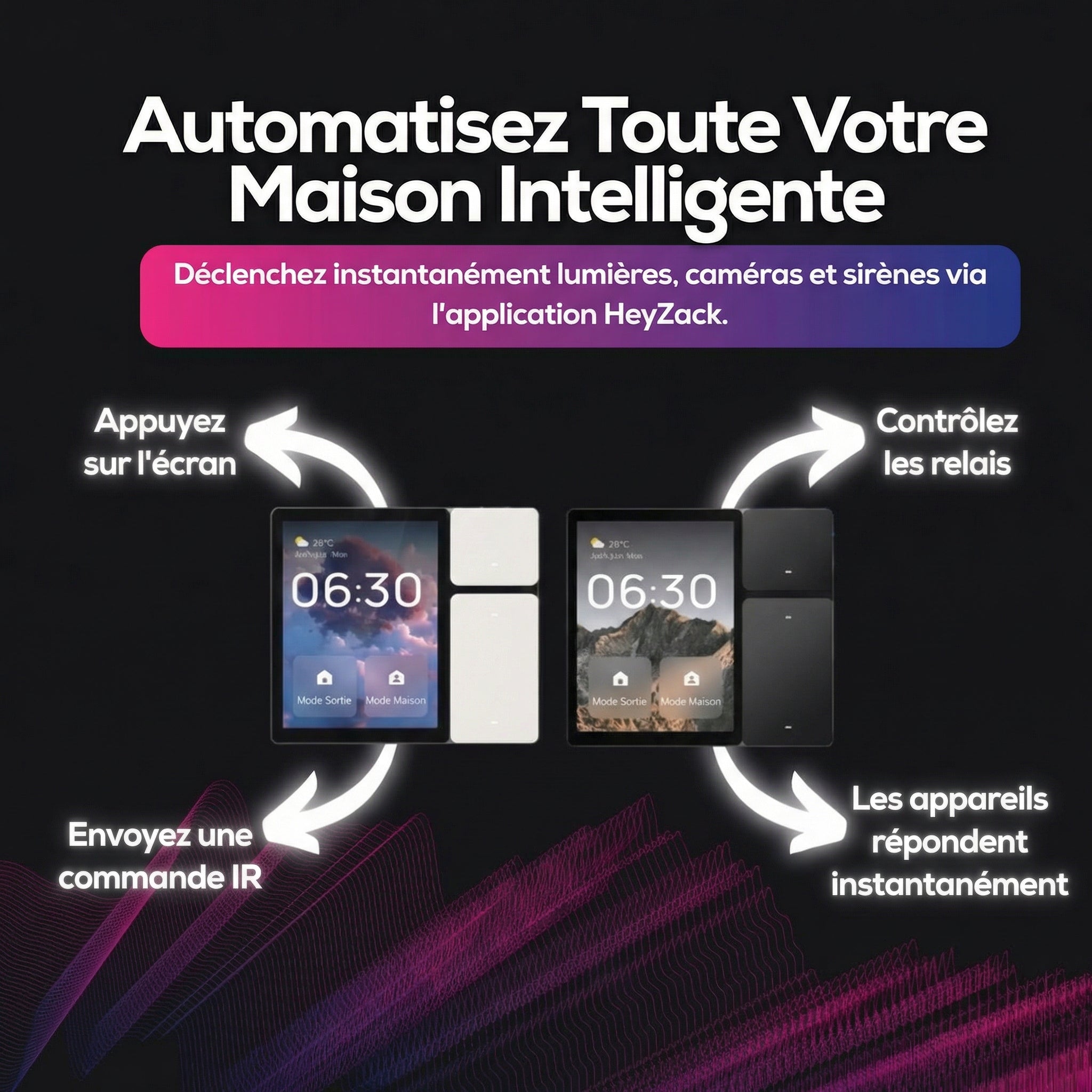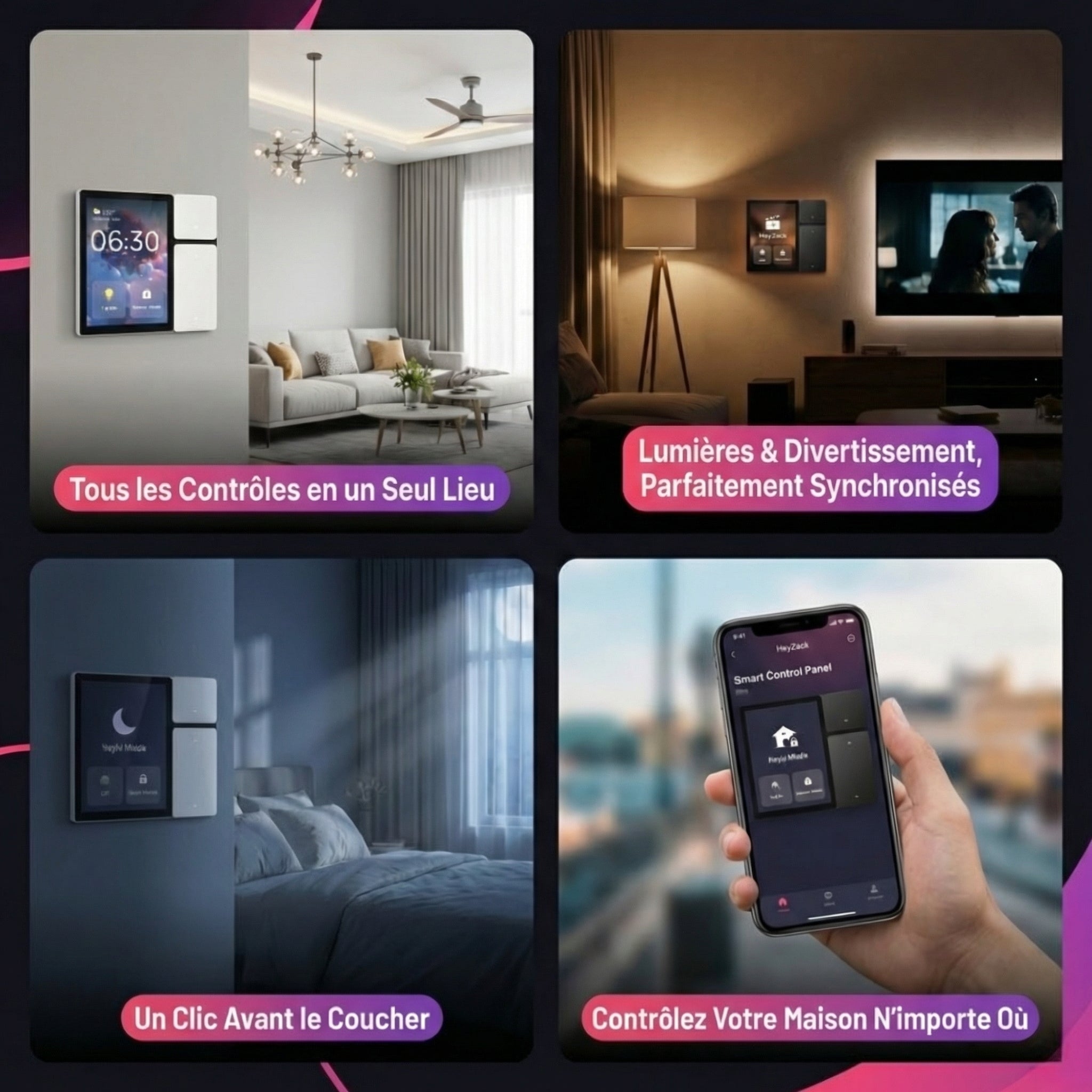 Contrôlez l'éclairage, les serrures, la climatisation et les scénarios depuis n'importe où grâce à l'application HeyZack Smart Control — gratuite sur iOS et Android.