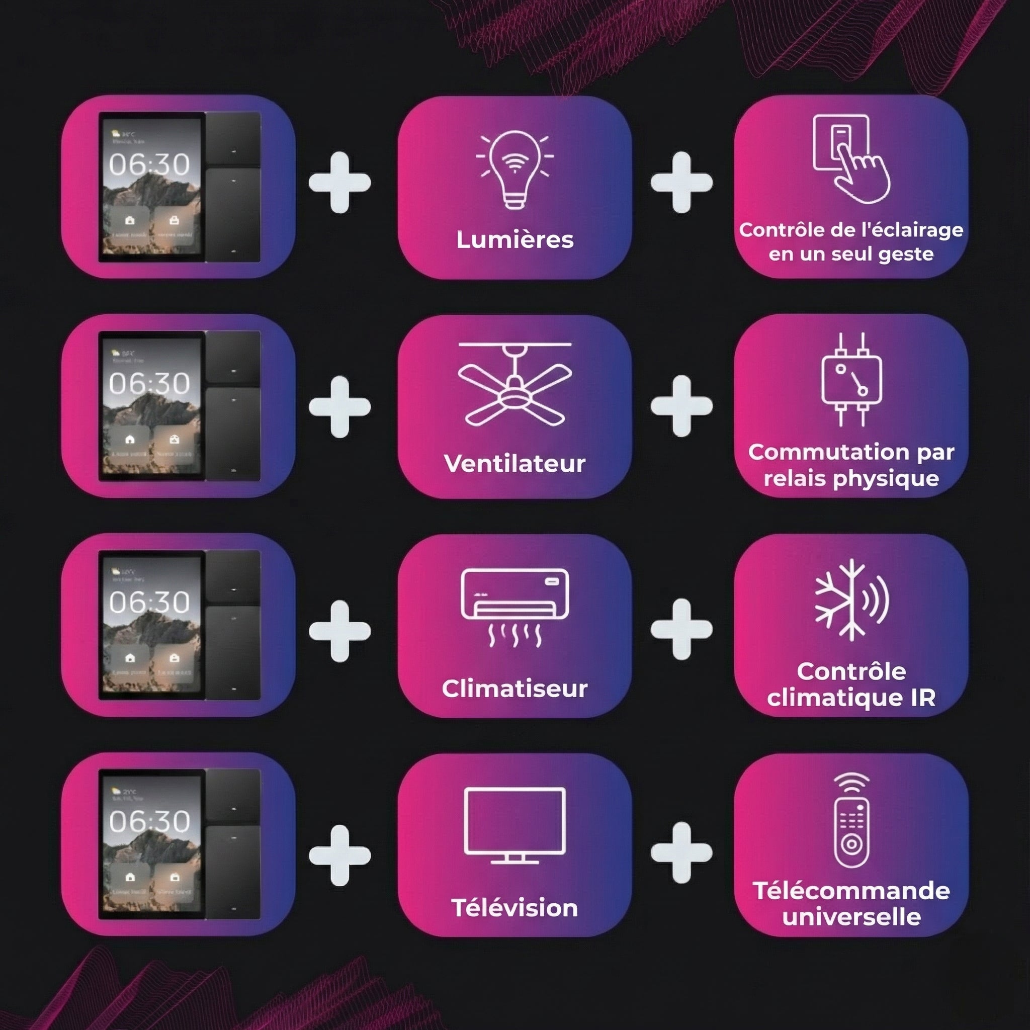 Transformez vos murs en centres de contrôle. Gérez trois circuits et des appareils infrarouges depuis un seul écran tactile élégant.