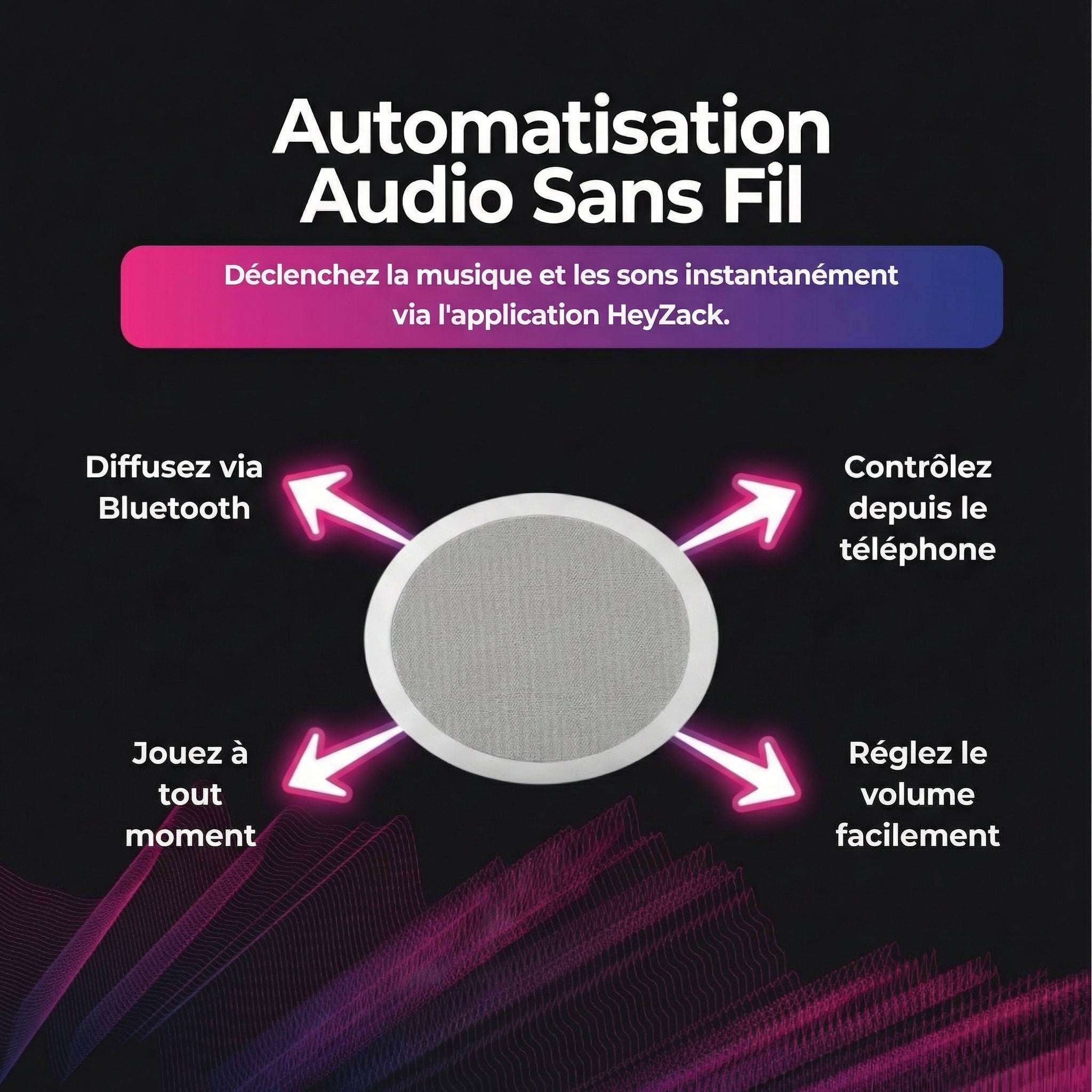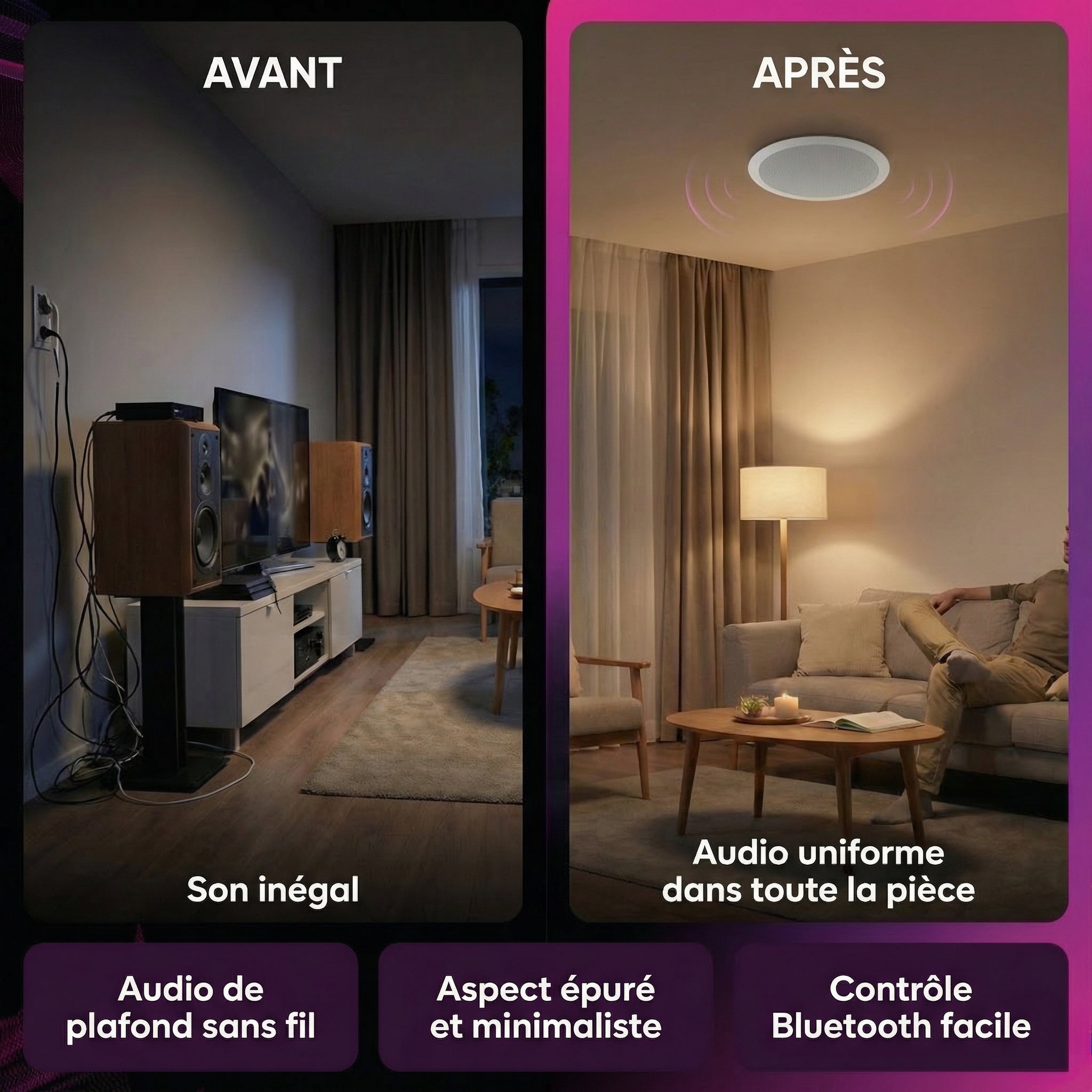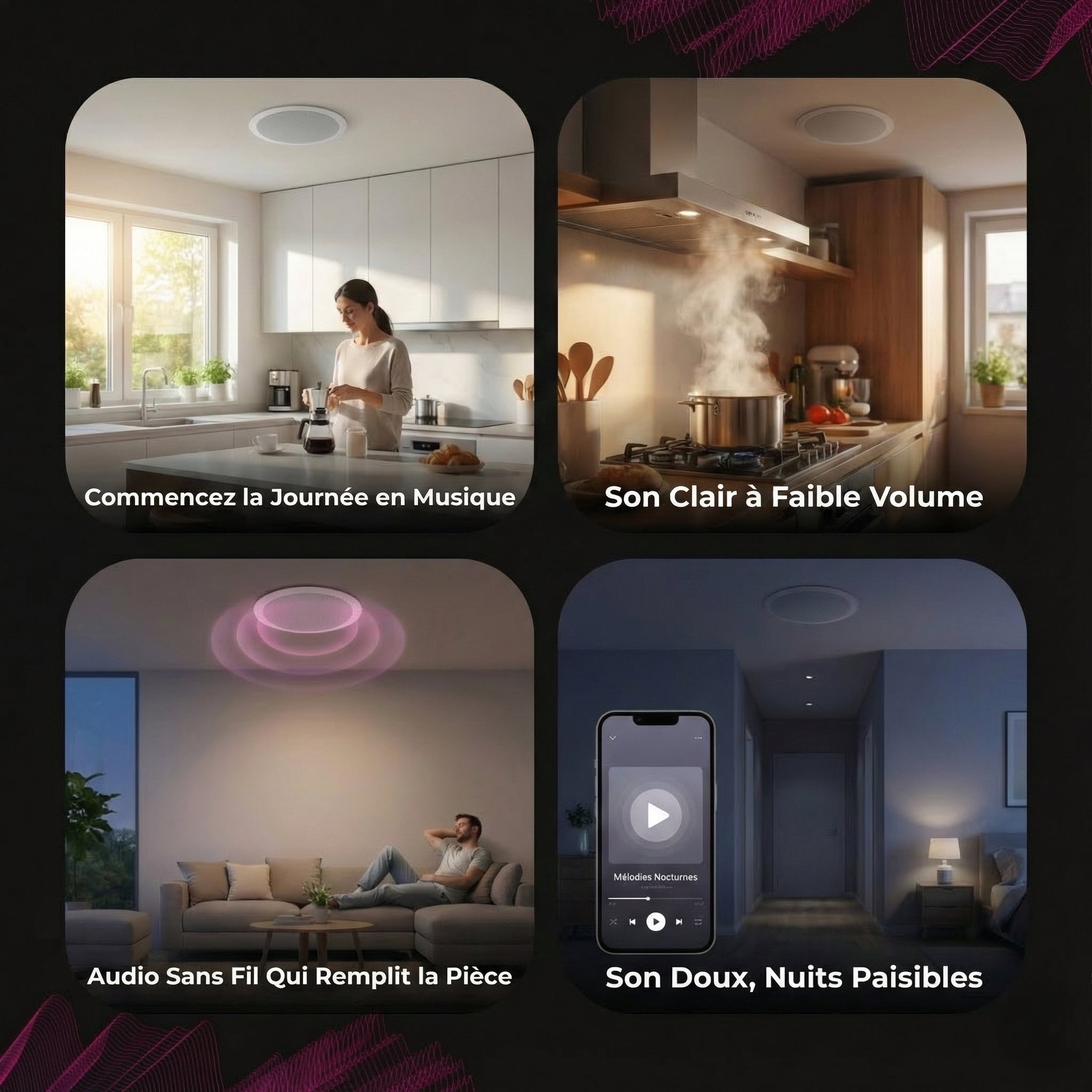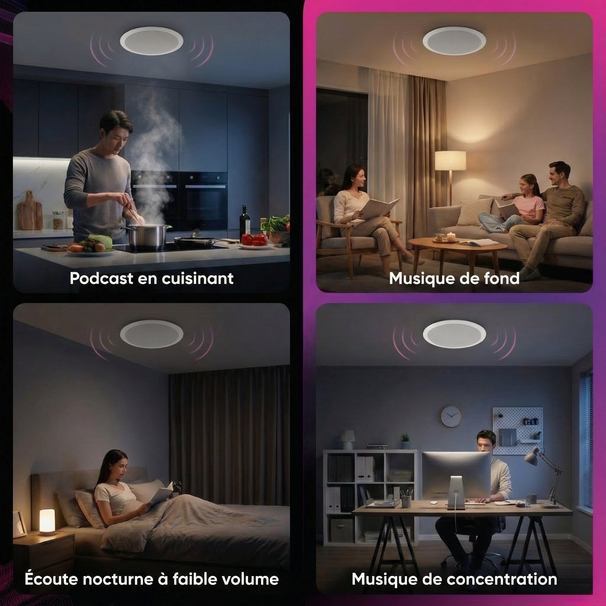 La musique vous accompagne dans toutes les pièces sans qu'aucun haut-parleur ne soit visible. Votre plafond devient une symphonie invisible qui réagit à chacune de vos humeurs.