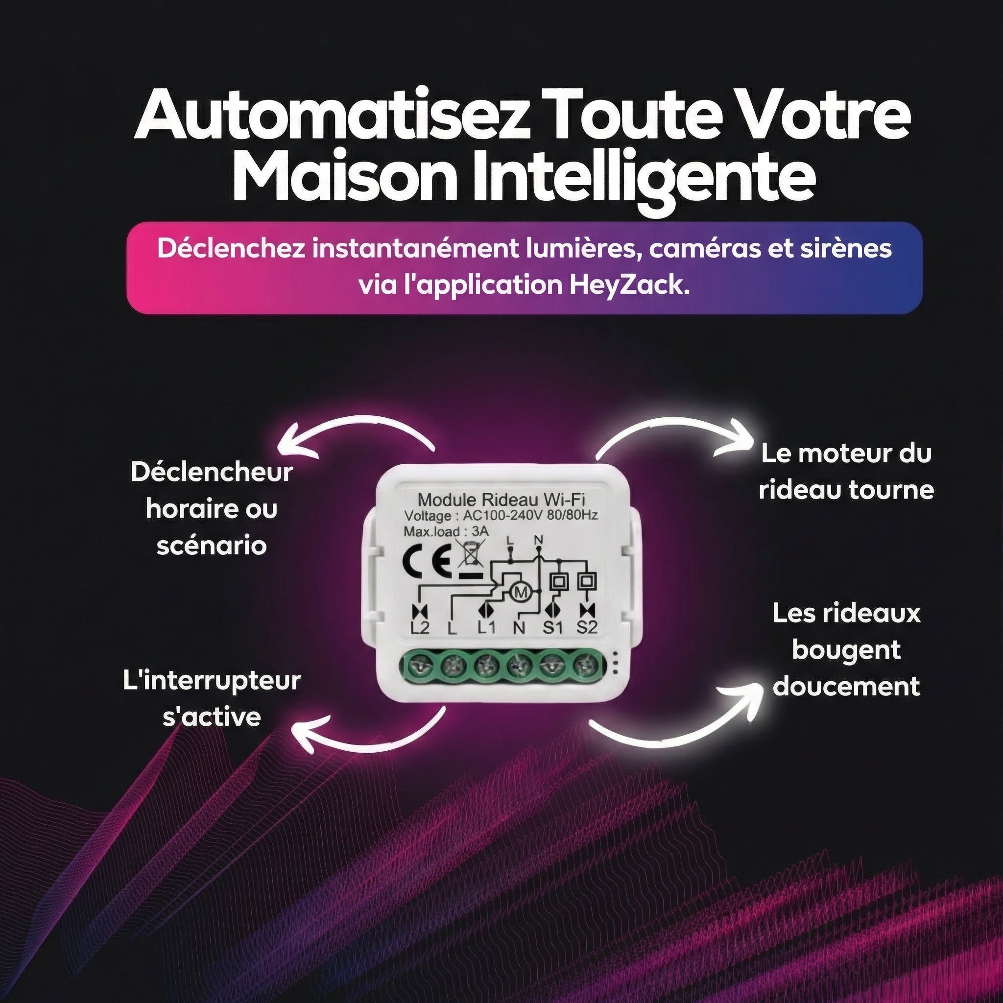 Contrôlez l'éclairage, les serrures, la climatisation et les scénarios depuis n'importe où grâce à l'application HeyZack Smart Control — gratuite sur iOS et Android.