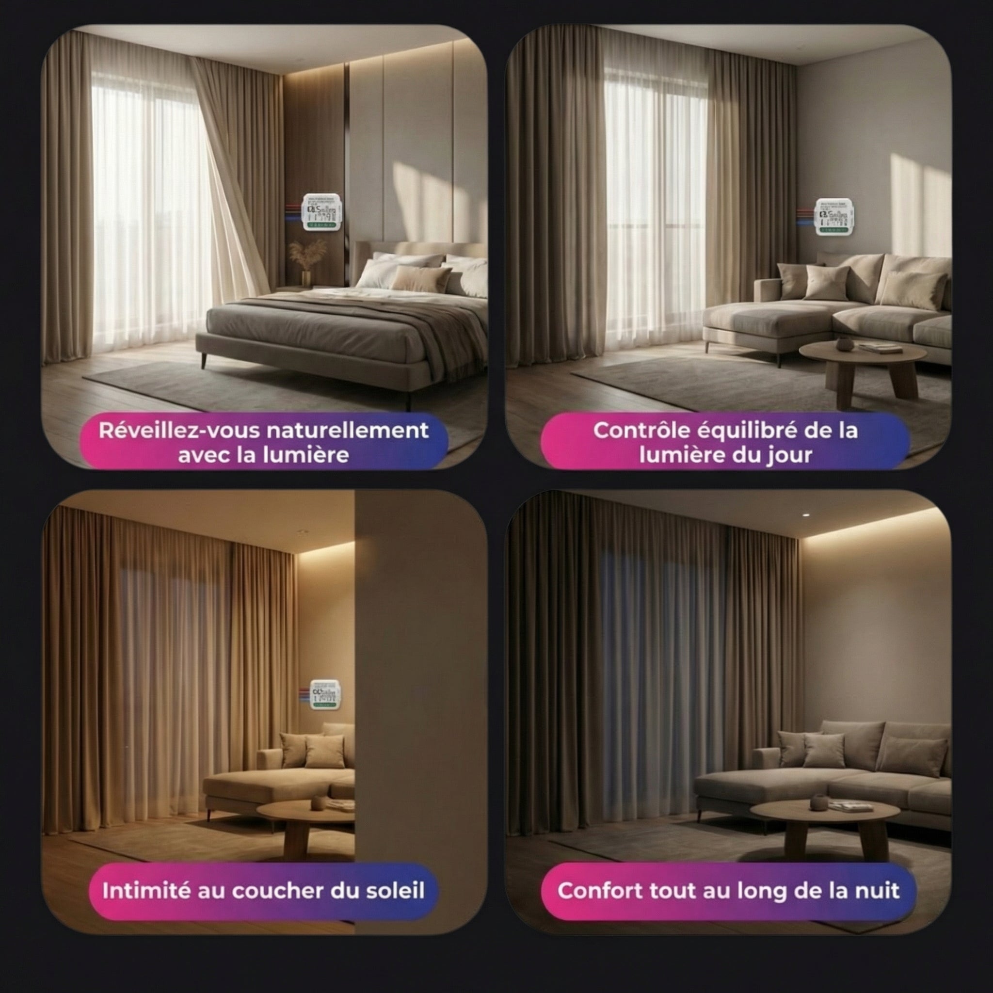 • Programmez sans effort des réveils en douceur au lever du soleil et des fermetures automatiques au coucher du soleil.