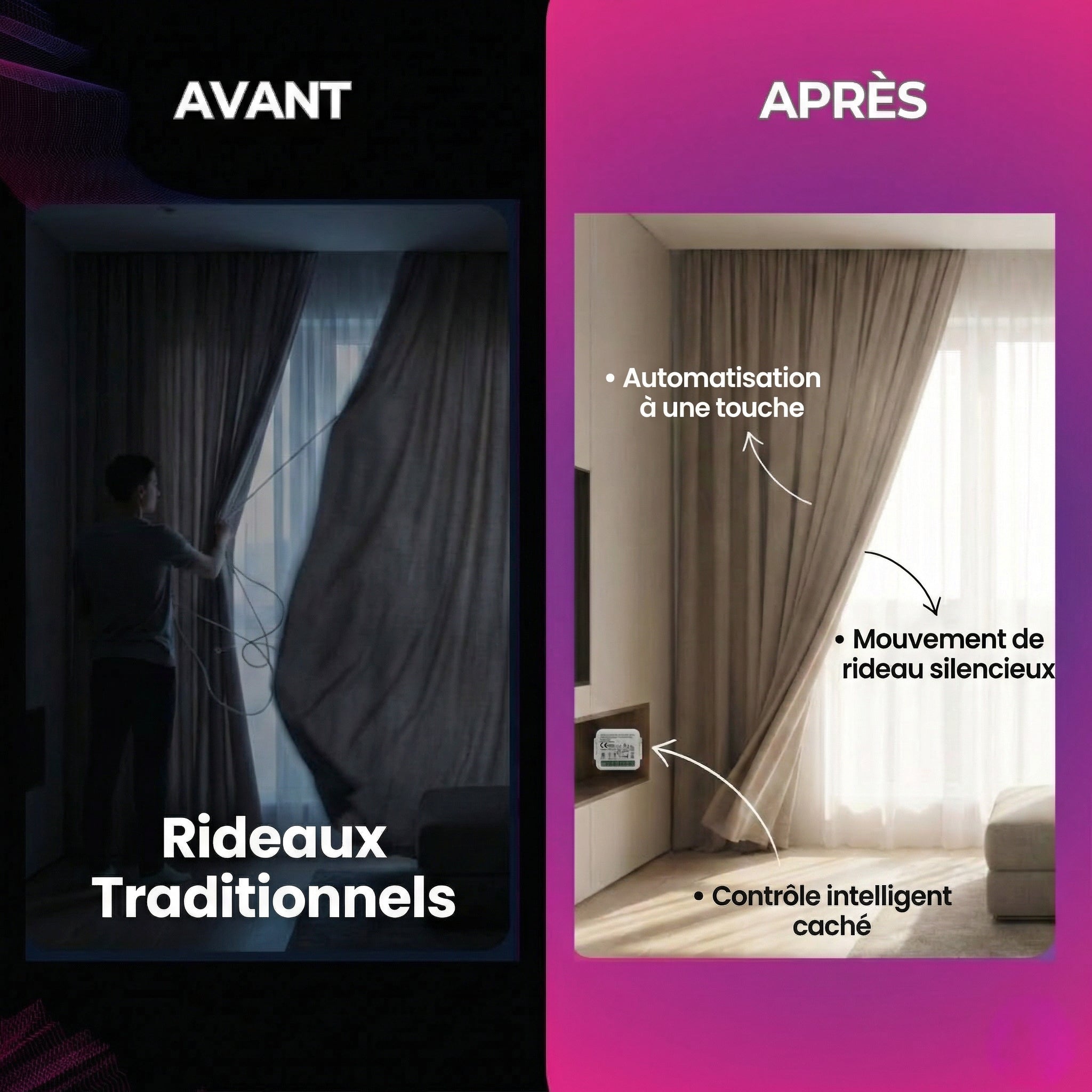 Transformez n'importe quelle fenêtre en un havre de paix instantané. Contrôlez la lumière du jour d'un murmure ou d'une simple pression.