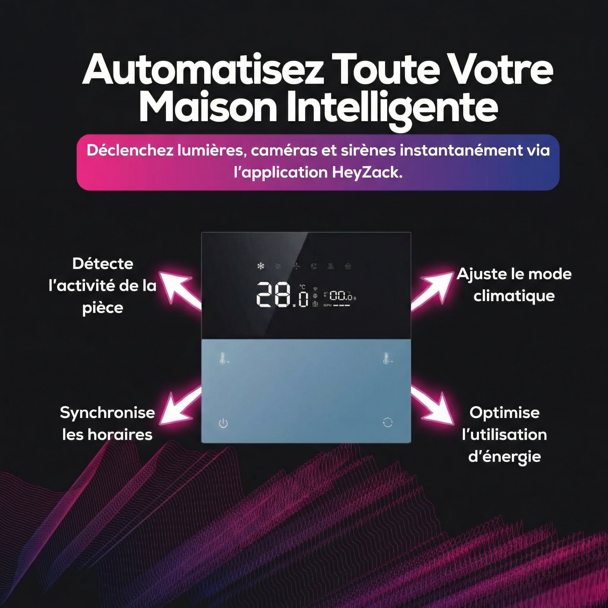 Contrôlez l'éclairage, les serrures, la climatisation et les scénarios depuis n'importe où grâce à l'application HeyZack Smart Control — gratuite sur iOS et Android.
