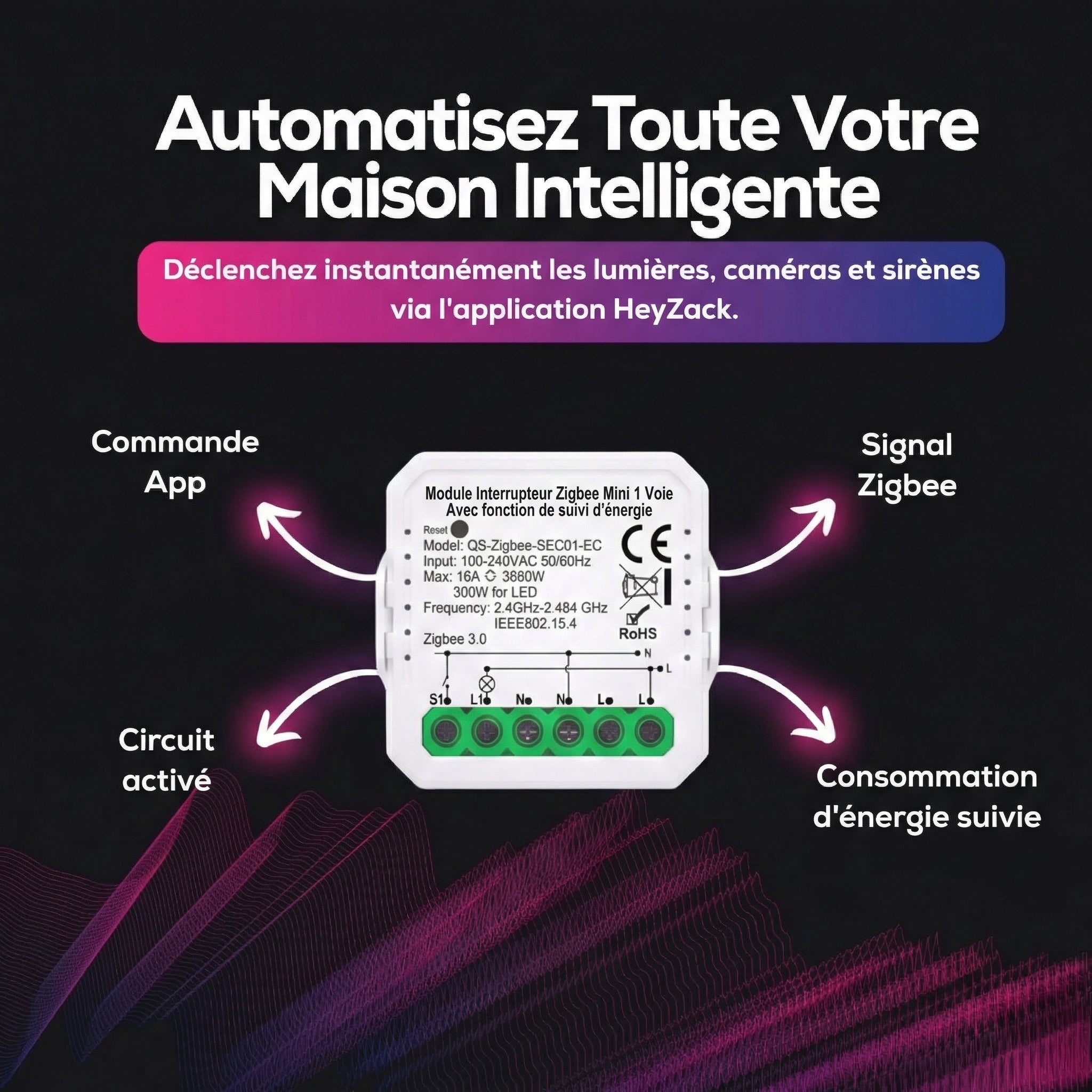 Contrôlez l'éclairage, les serrures, la climatisation et les scénarios depuis n'importe où grâce à l'application HeyZack Smart Control — gratuite sur iOS et Android.