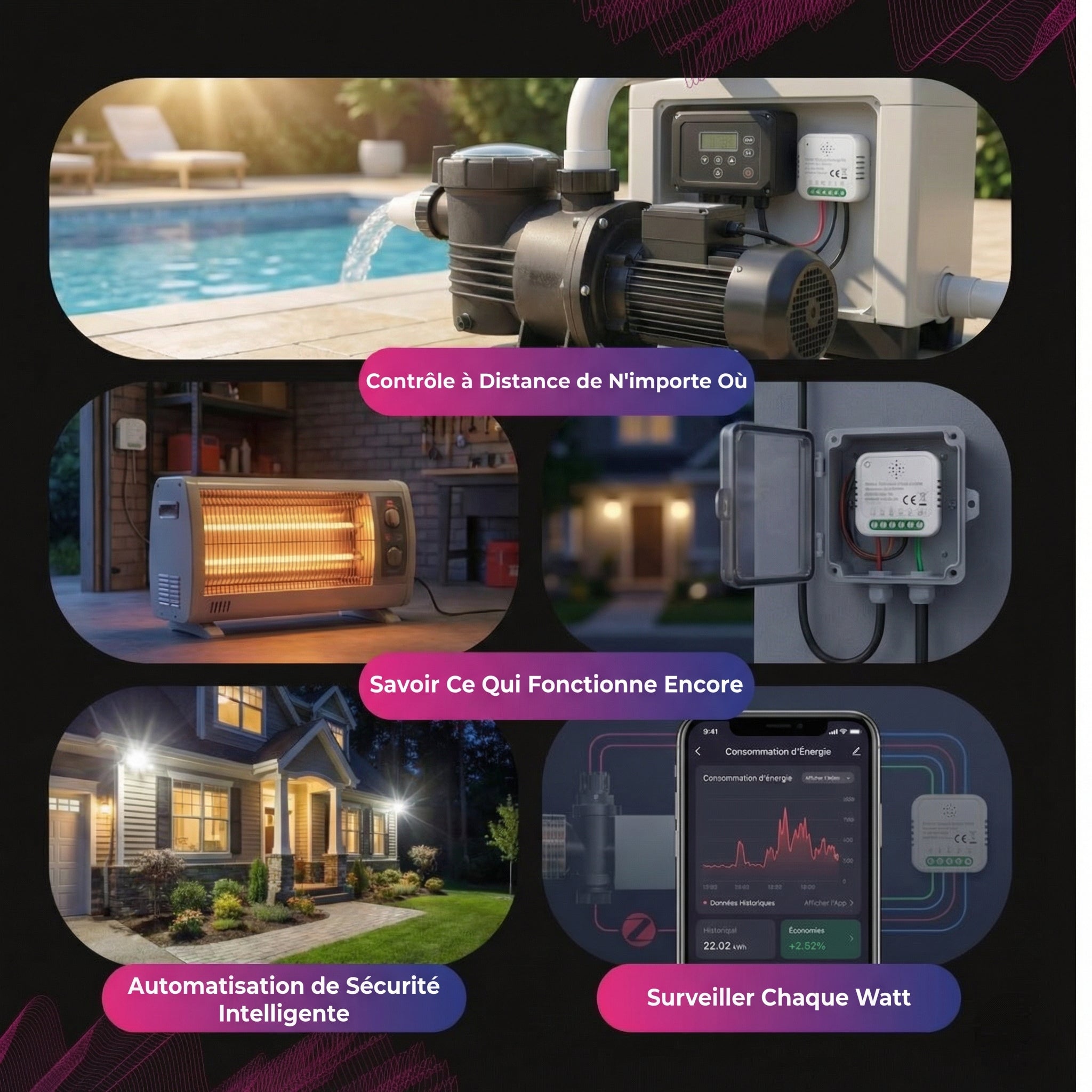 • Contrôlez à distance les lumières, les pompes ou les radiateurs grâce à un suivi de puissance 16A en temps réel.