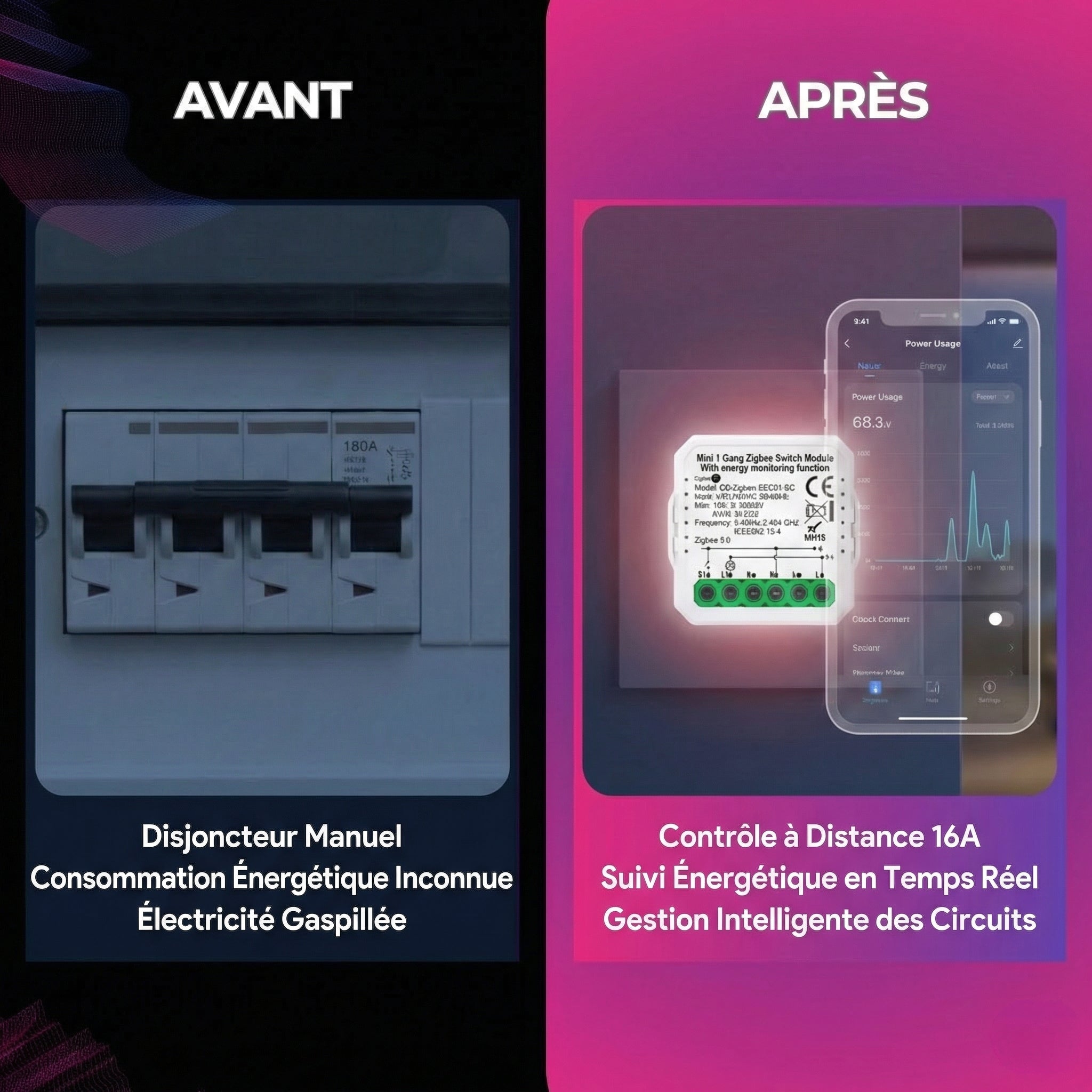 Transformez n'importe quel circuit en un interrupteur intelligent qui anticipe les besoins. Surveillez l'alimentation à distance tout en conservant un contrôle manuel total.