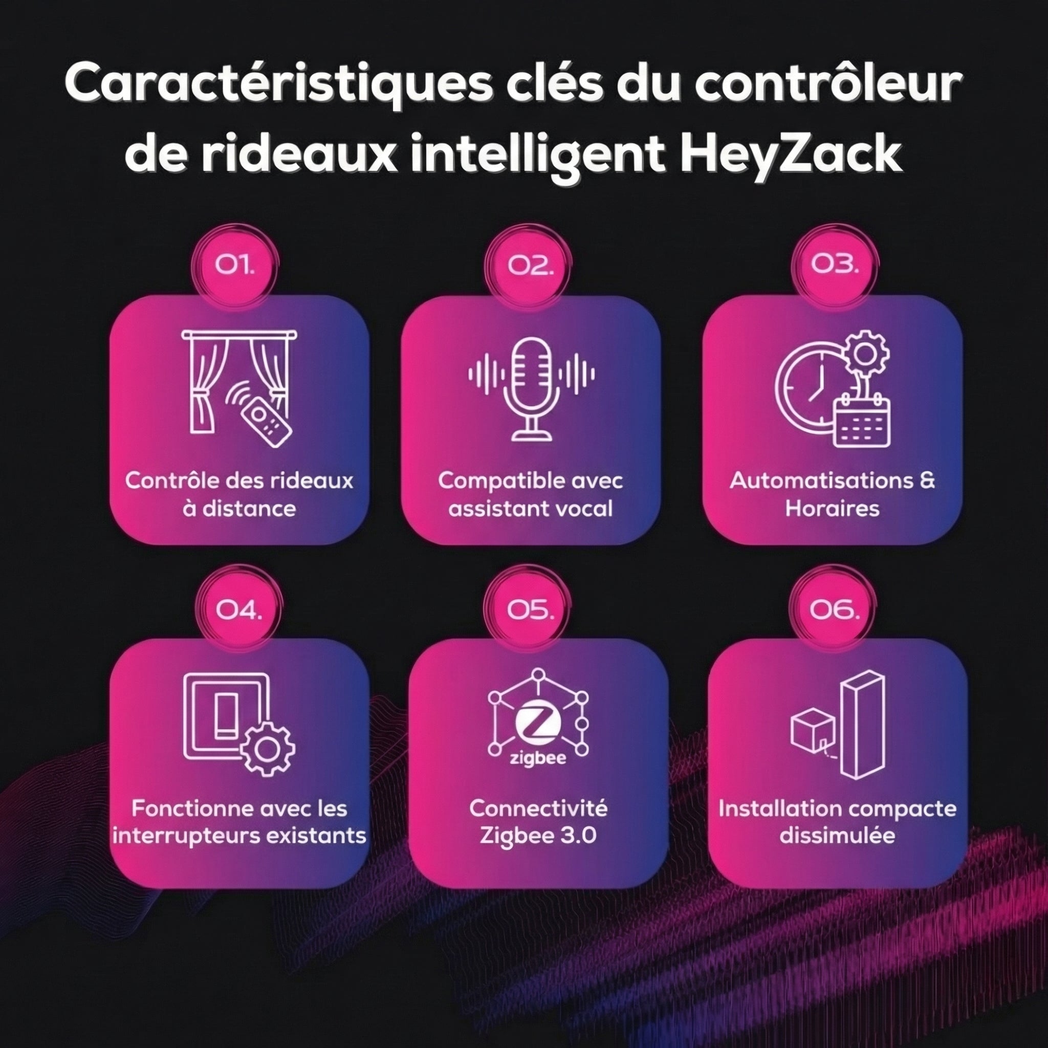 Contrôlez l'éclairage, les serrures, la climatisation et les scénarios depuis n'importe où grâce à l'application HeyZack Smart Control — gratuite sur iOS et Android.