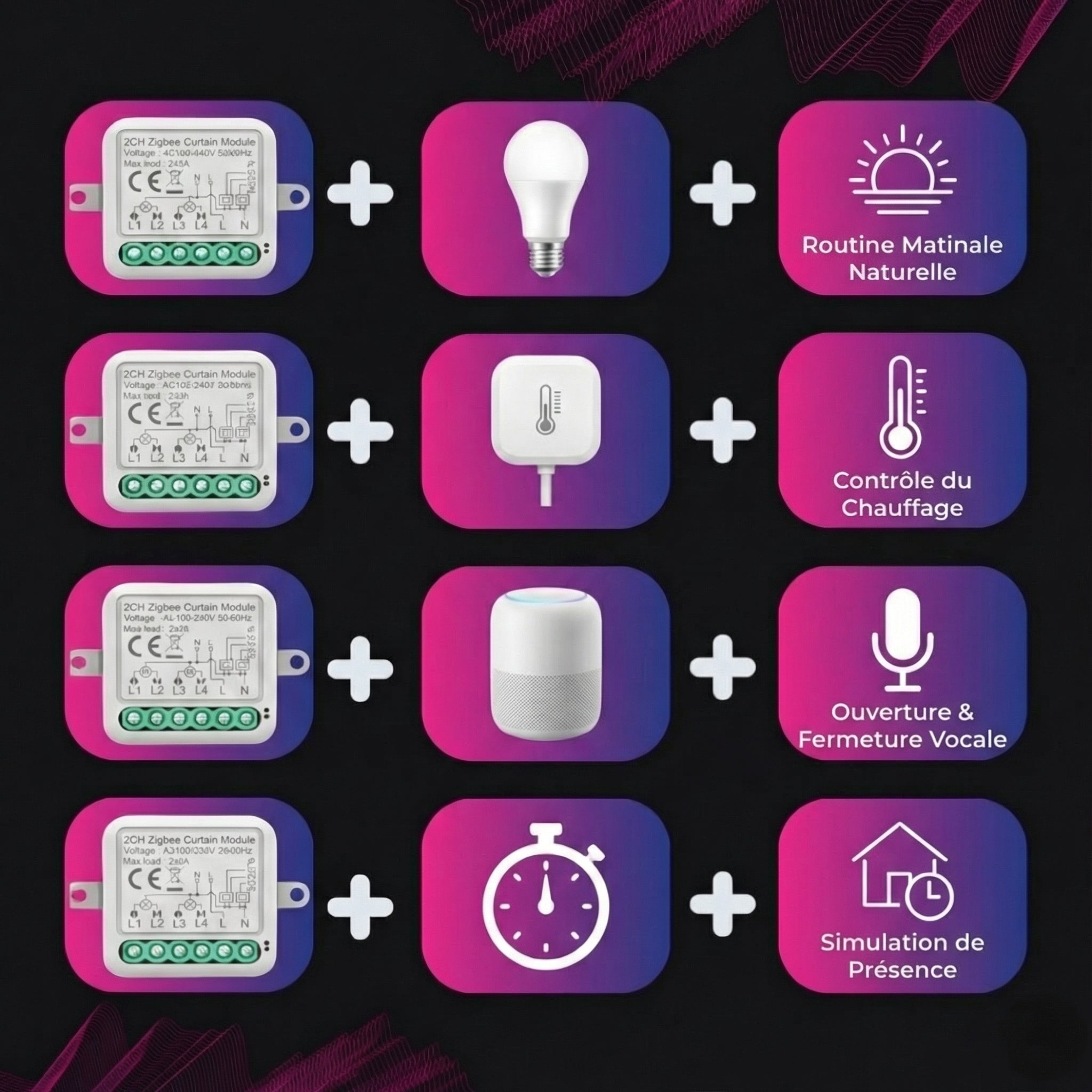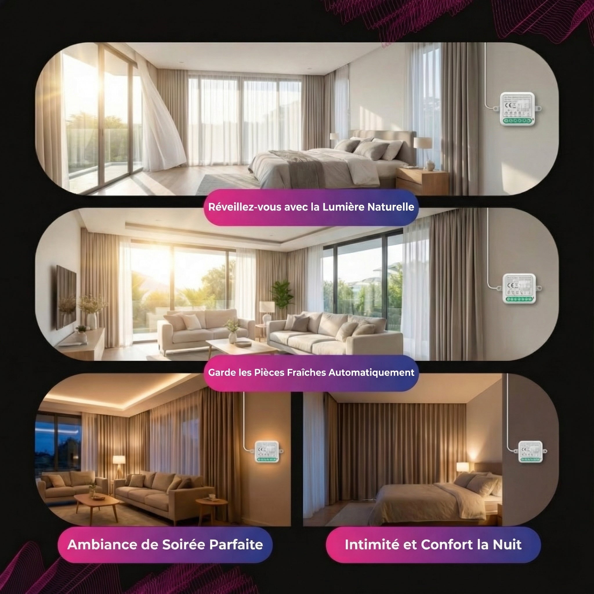 Transformez vos rideaux en stores intelligents qui s'adaptent à votre rythme de vie. Ouvrez-les au lever du soleil, fermez-les pour plus d'intimité, sans lever le petit doigt.