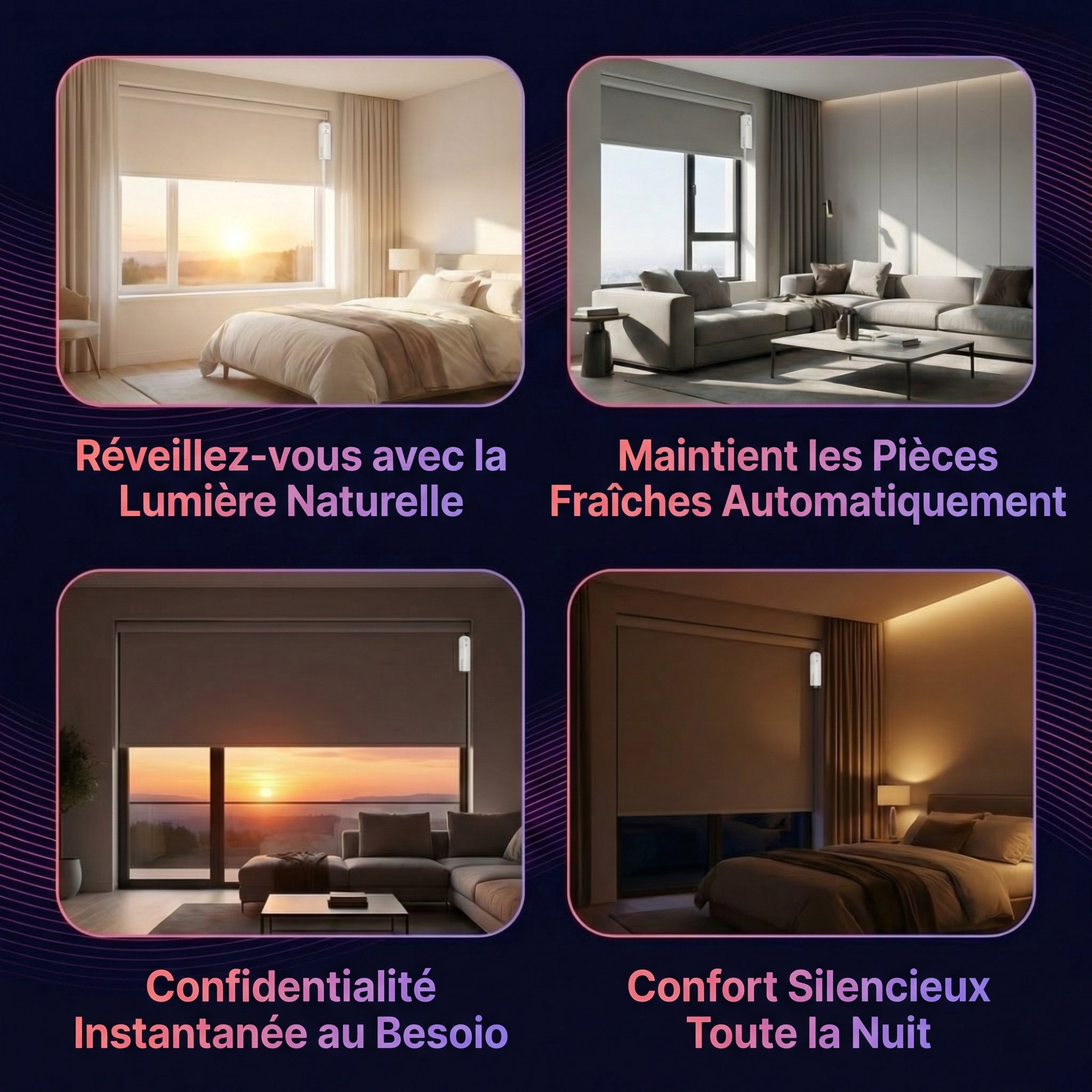 Vos stores suivent la lumière, ils ne la combattent pas. Réveillez-vous aux doux rayons du matin et dormez dans l'obscurité parfaite.