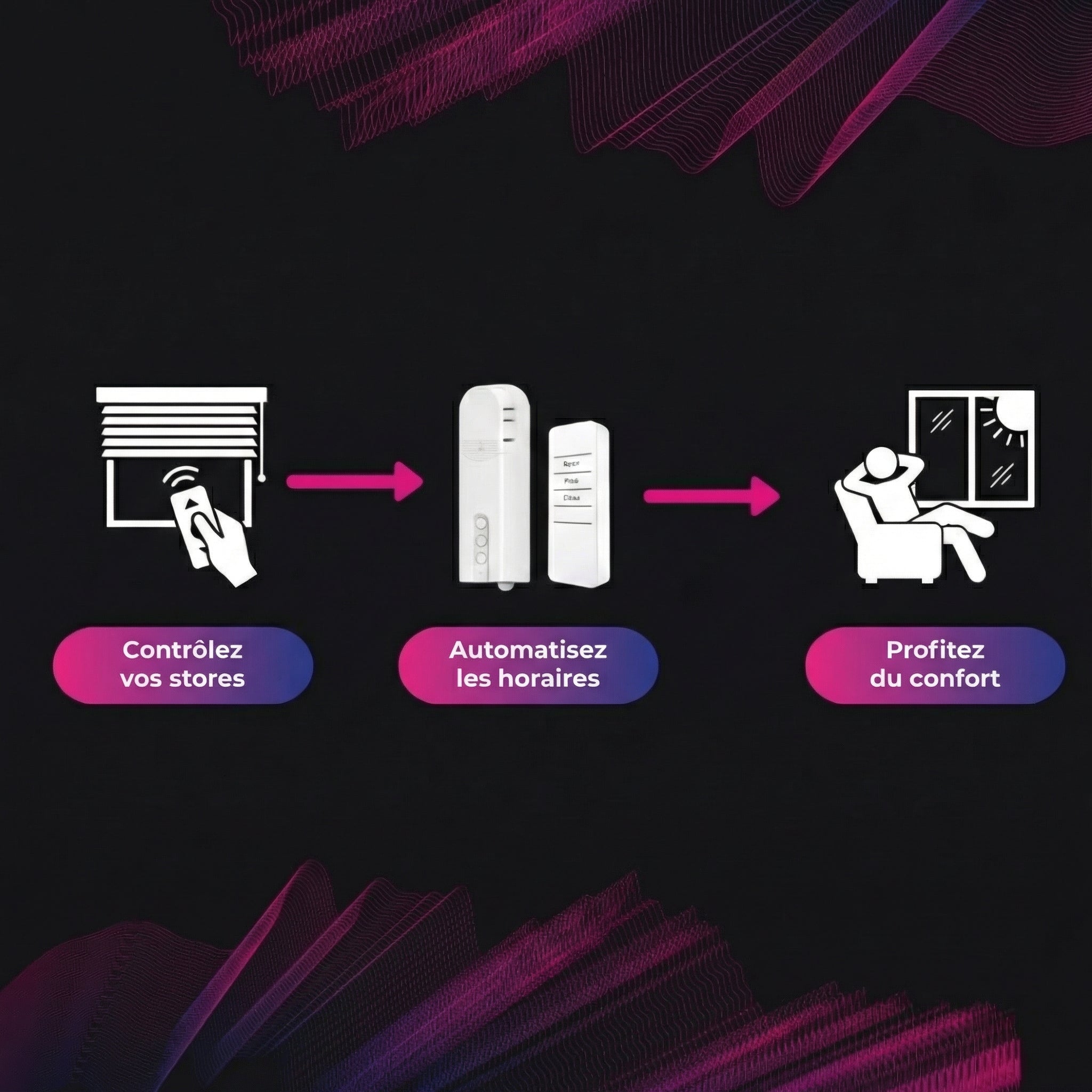 • Contrôlez tous les stores depuis votre lit ou votre canapé d'une simple pression.