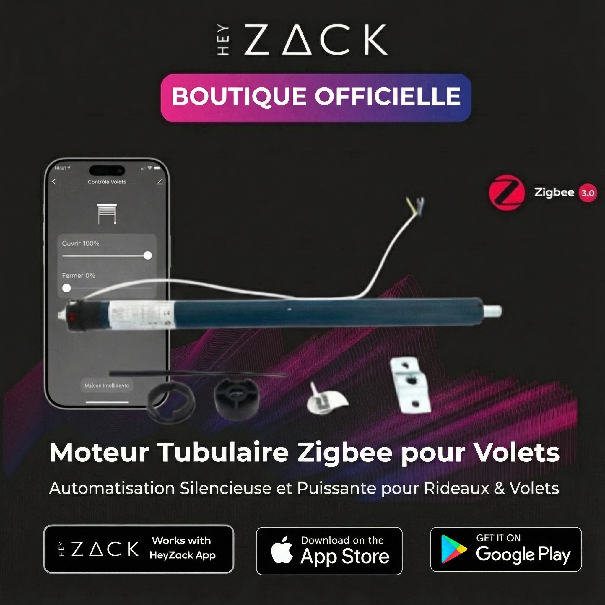 Contrôlez l'éclairage, les serrures, la climatisation et les scénarios depuis n'importe où grâce à l'application HeyZack Smart Control — gratuite sur iOS et Android.