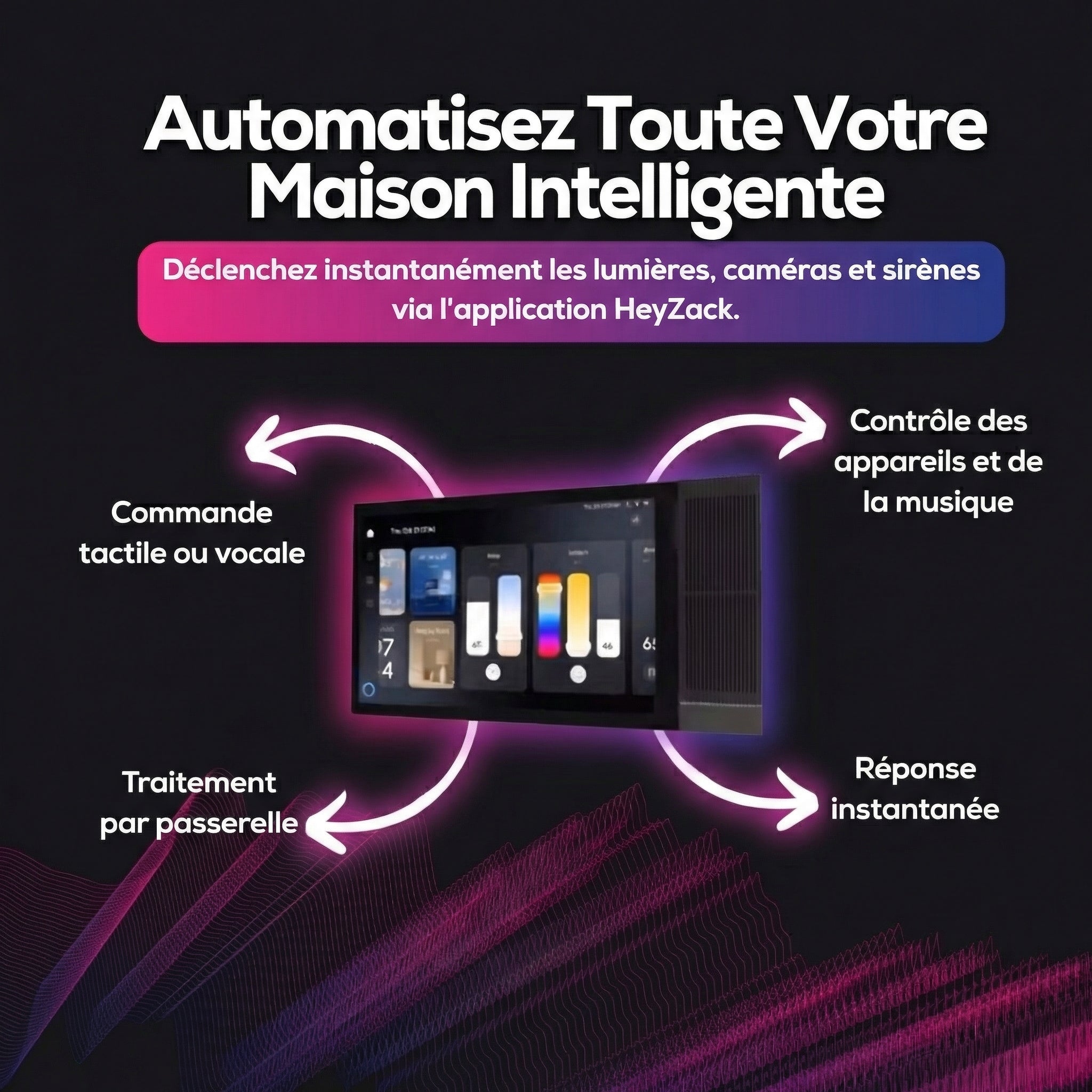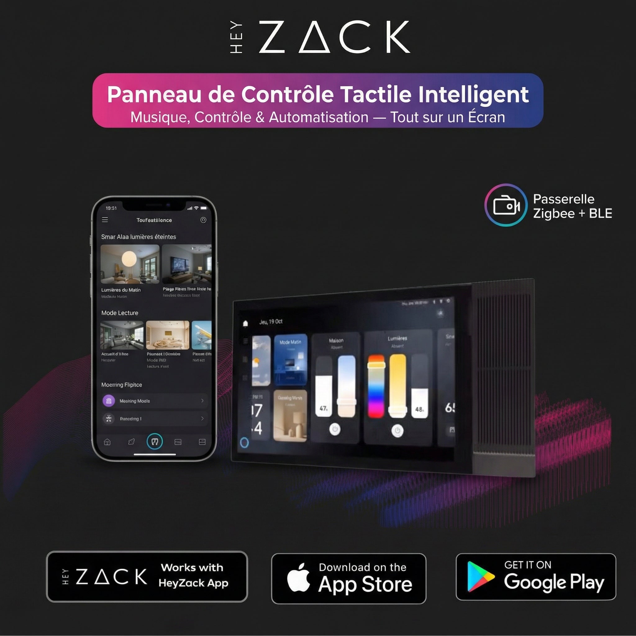 Contrôlez l'éclairage, les serrures, la climatisation et les scénarios depuis n'importe où grâce à l'application HeyZack Smart Control — gratuite sur iOS et Android.