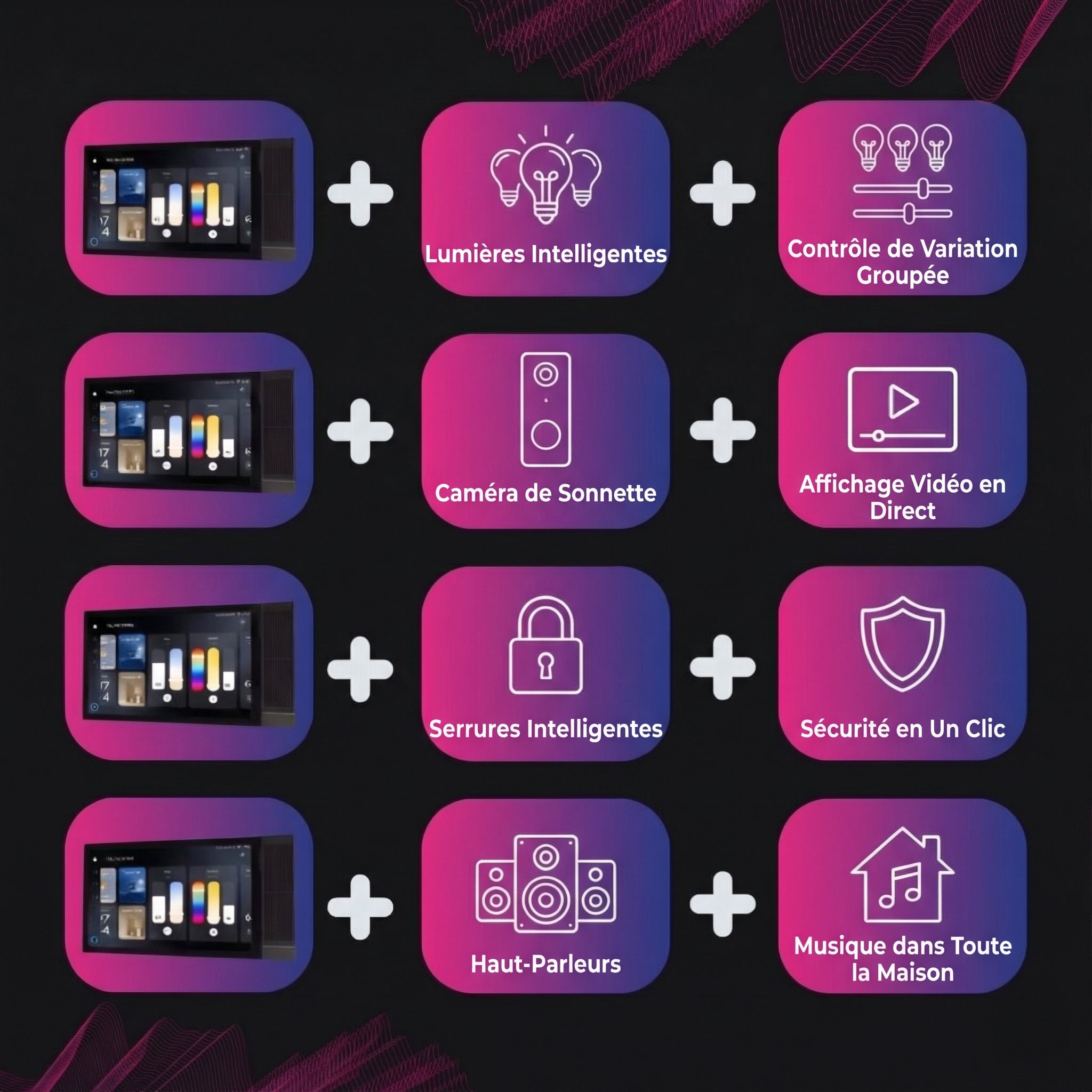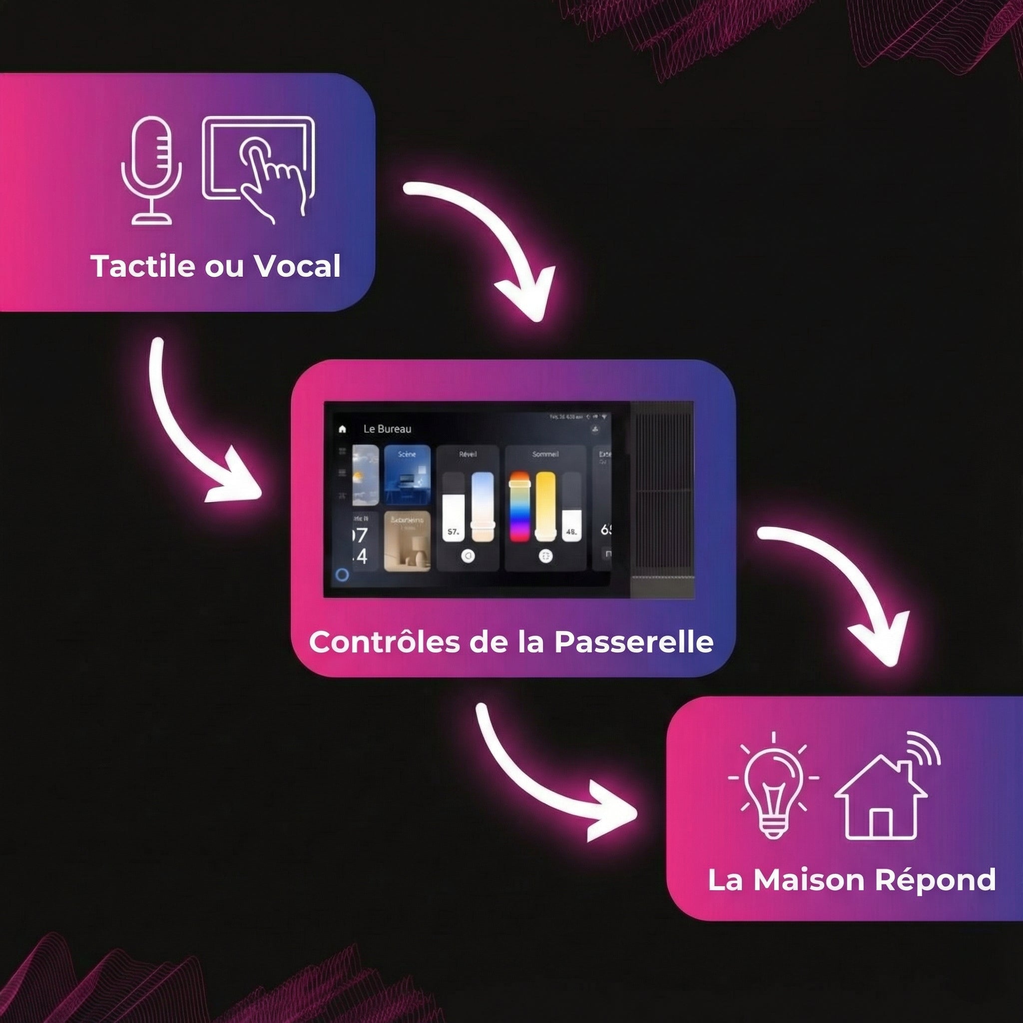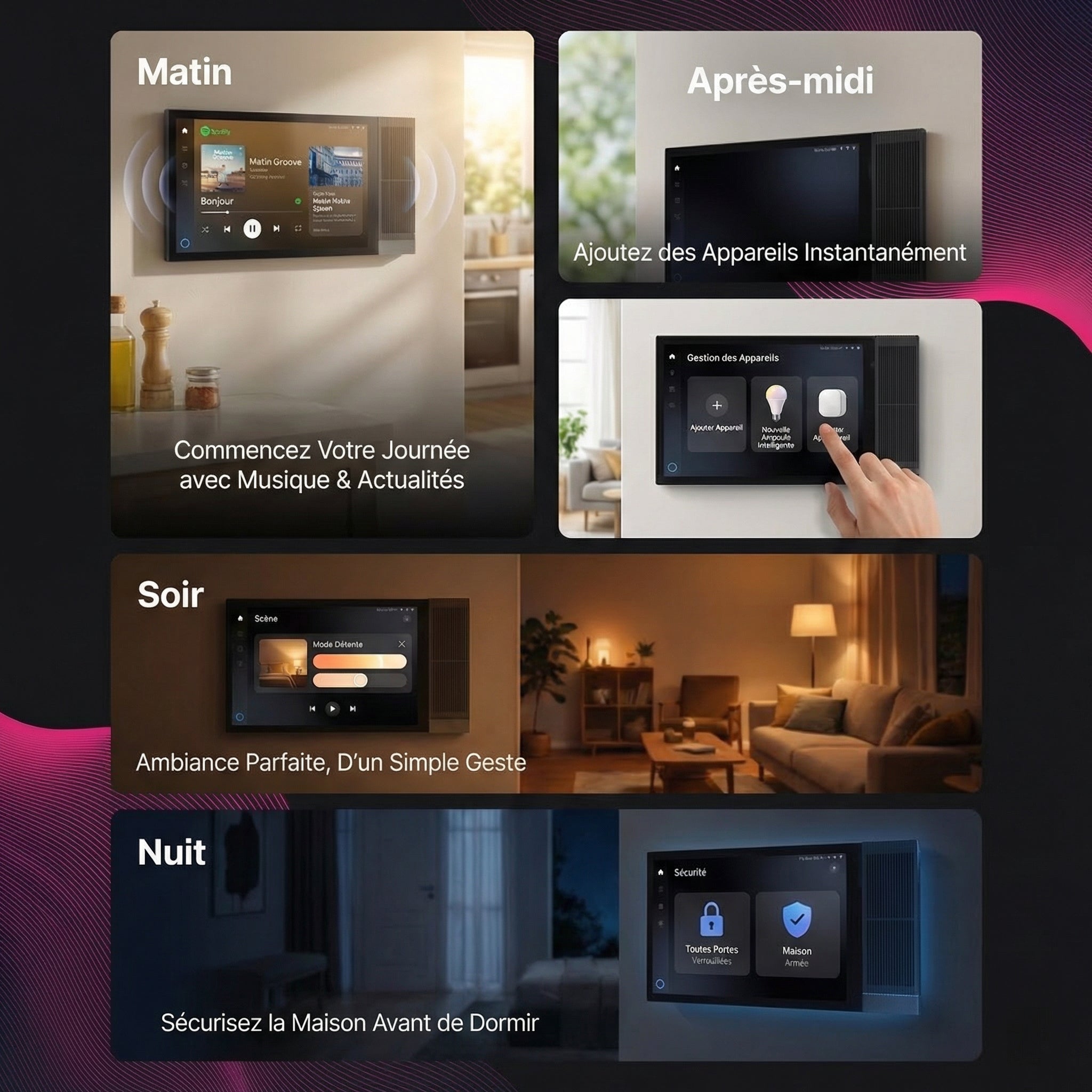 Contrôlez toutes les pièces depuis un seul écran élégant. Toute votre maison répond à une simple pression.