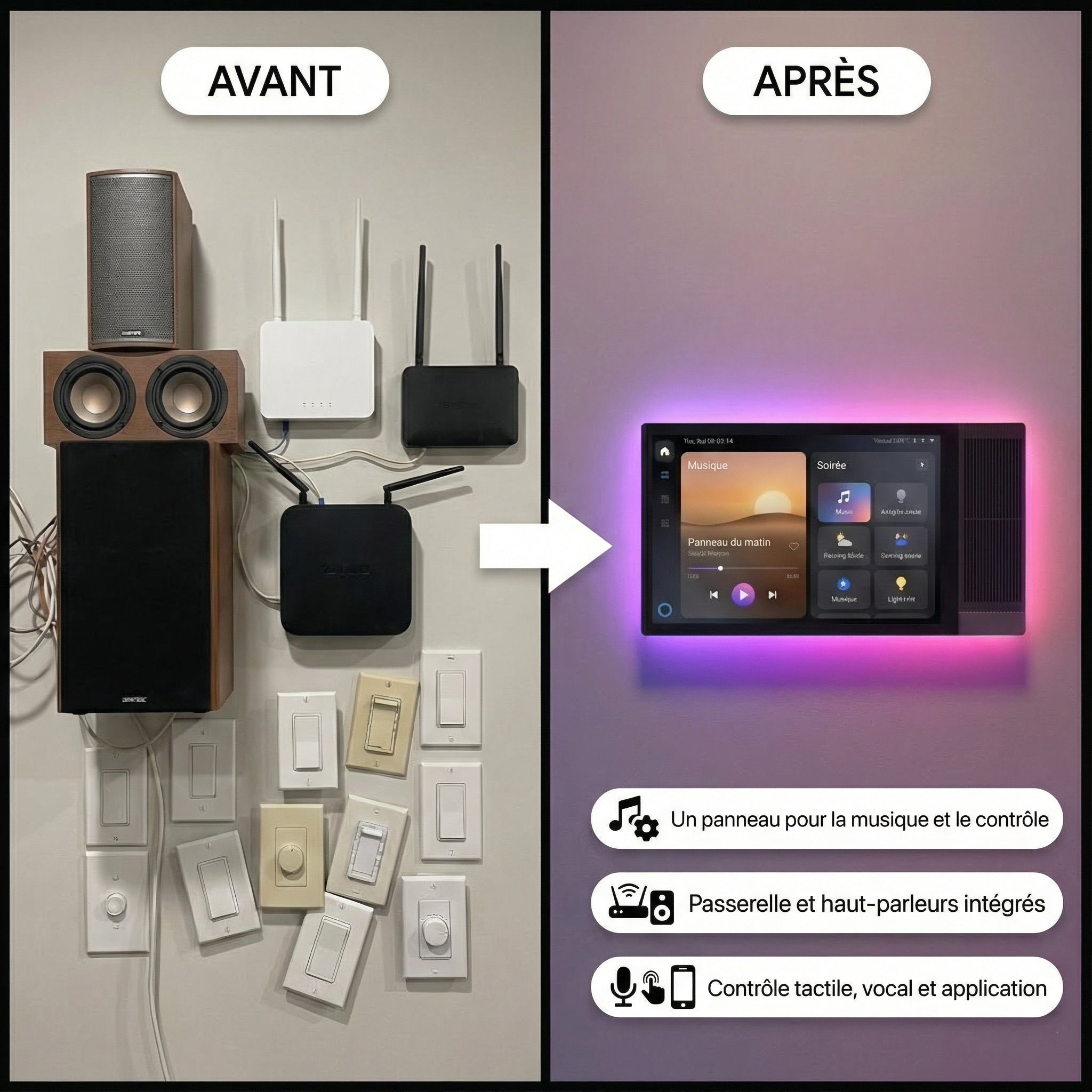 • Son design mural élégant remplace les interrupteurs encombrants par un panneau de verre minimaliste.