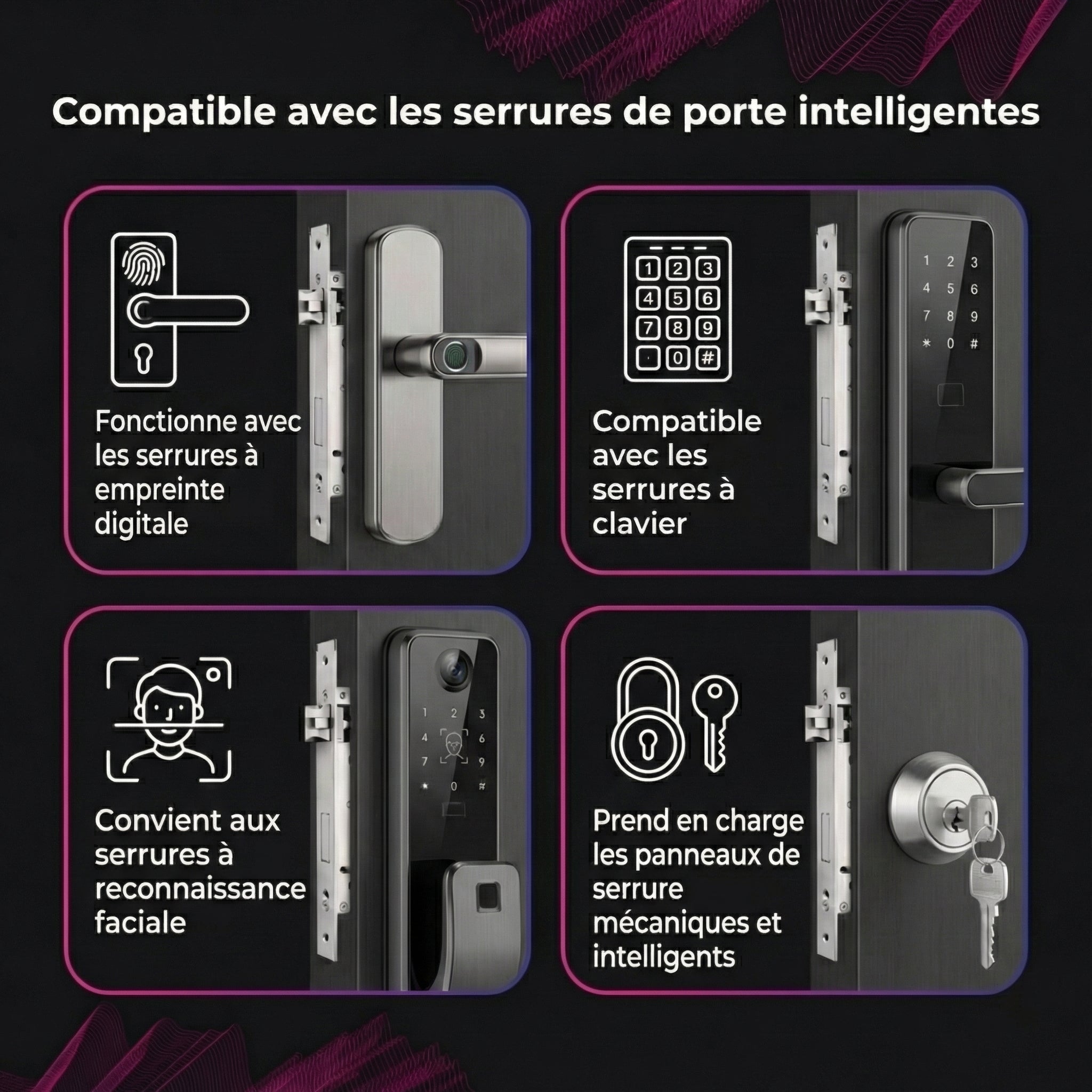 Compatible avec tous les systèmes de serrures connectées, son design universel s'intègre parfaitement aux assistants vocaux, aux écrans intelligents et aux appareils mobiles pour une intégration domestique complète.
