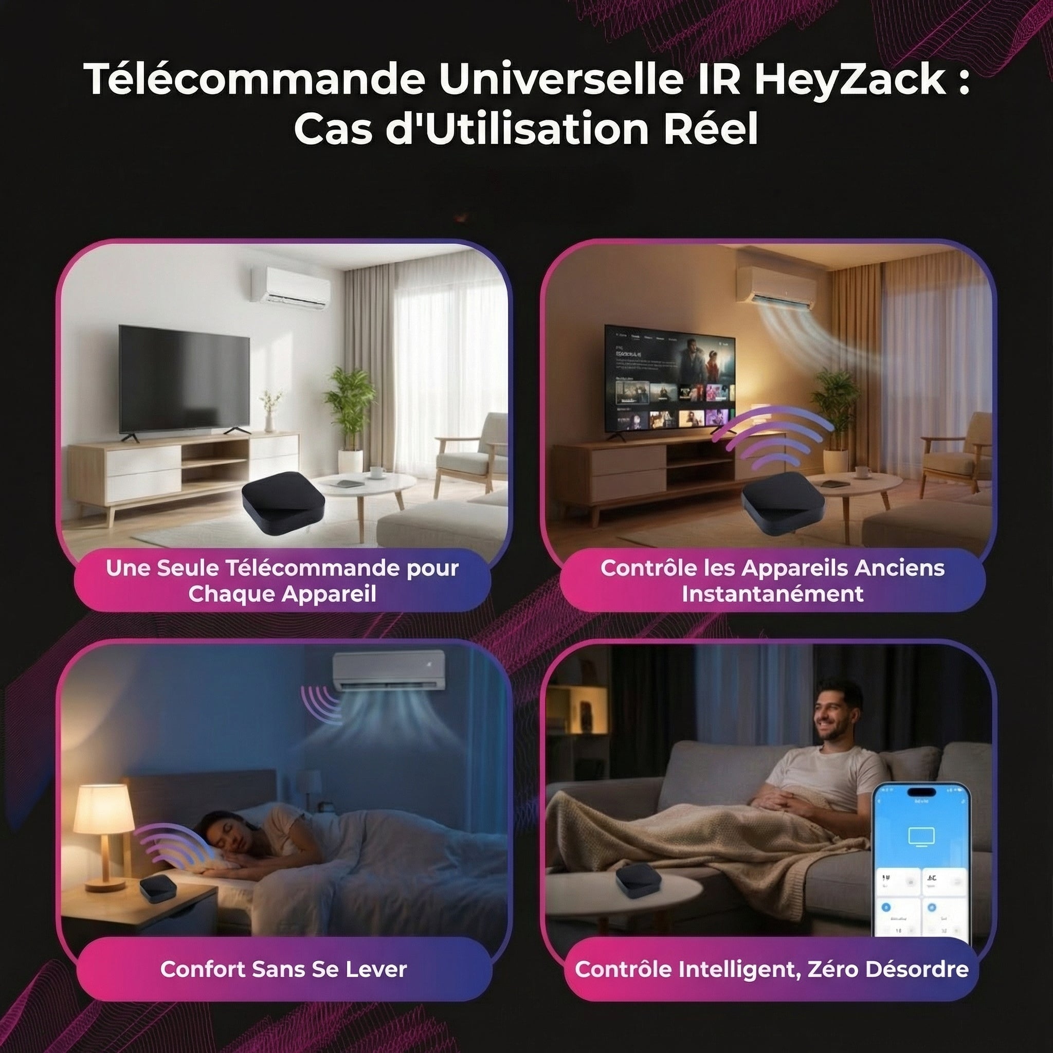 Contrôlez l'éclairage, les serrures, la climatisation et les scénarios depuis n'importe où grâce à l'application HeyZack Smart Control — gratuite sur iOS et Android.