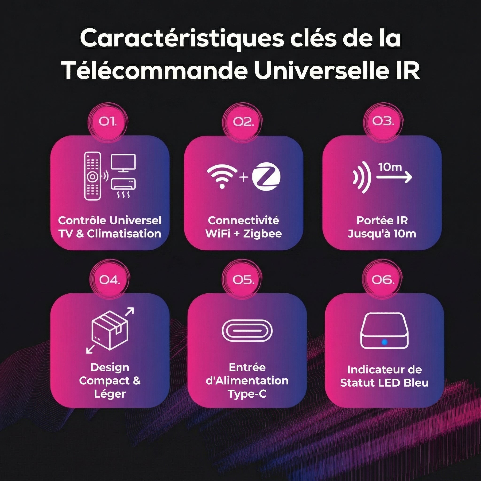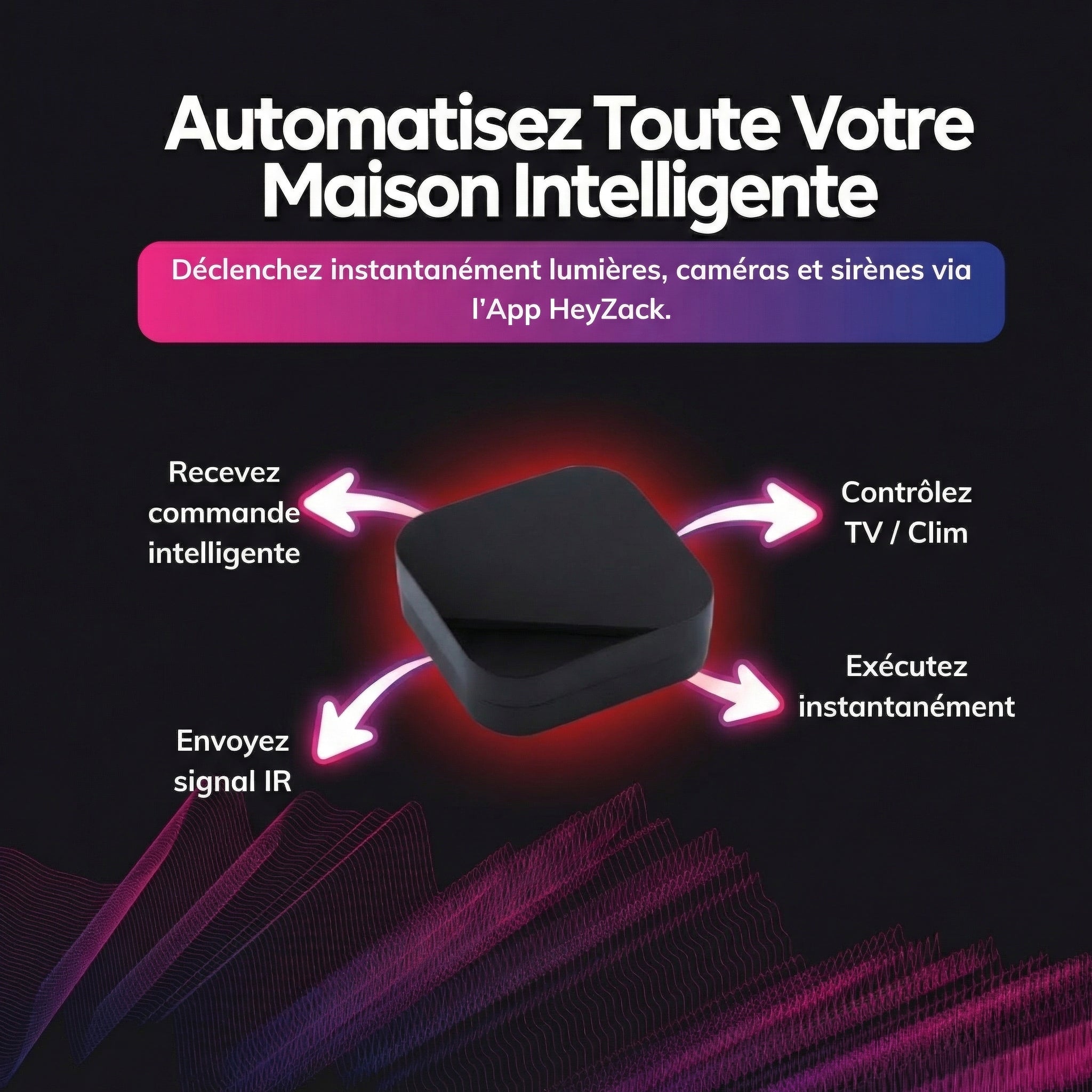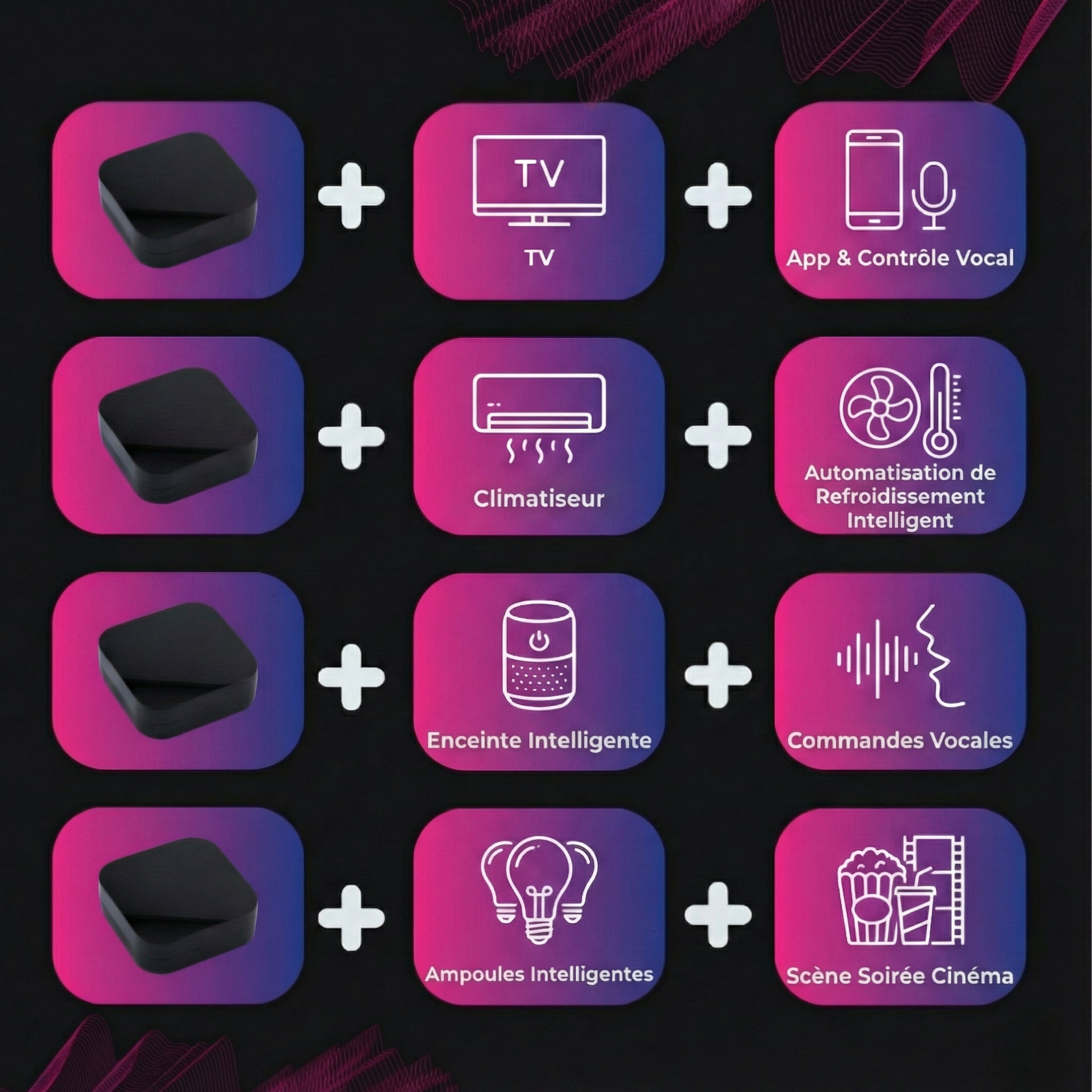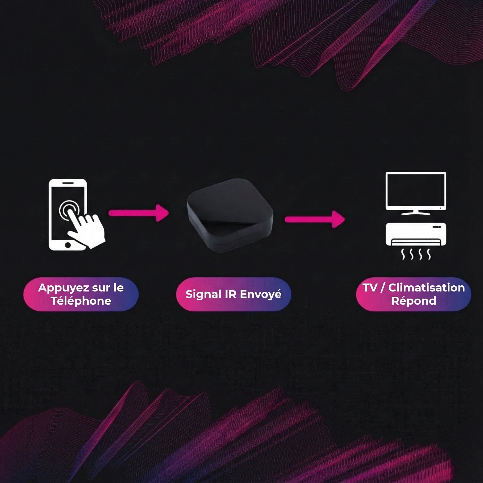 Contrôlez tous les appareils infrarouges de votre maison à distance. Un seul petit capteur remplace toutes vos télécommandes.