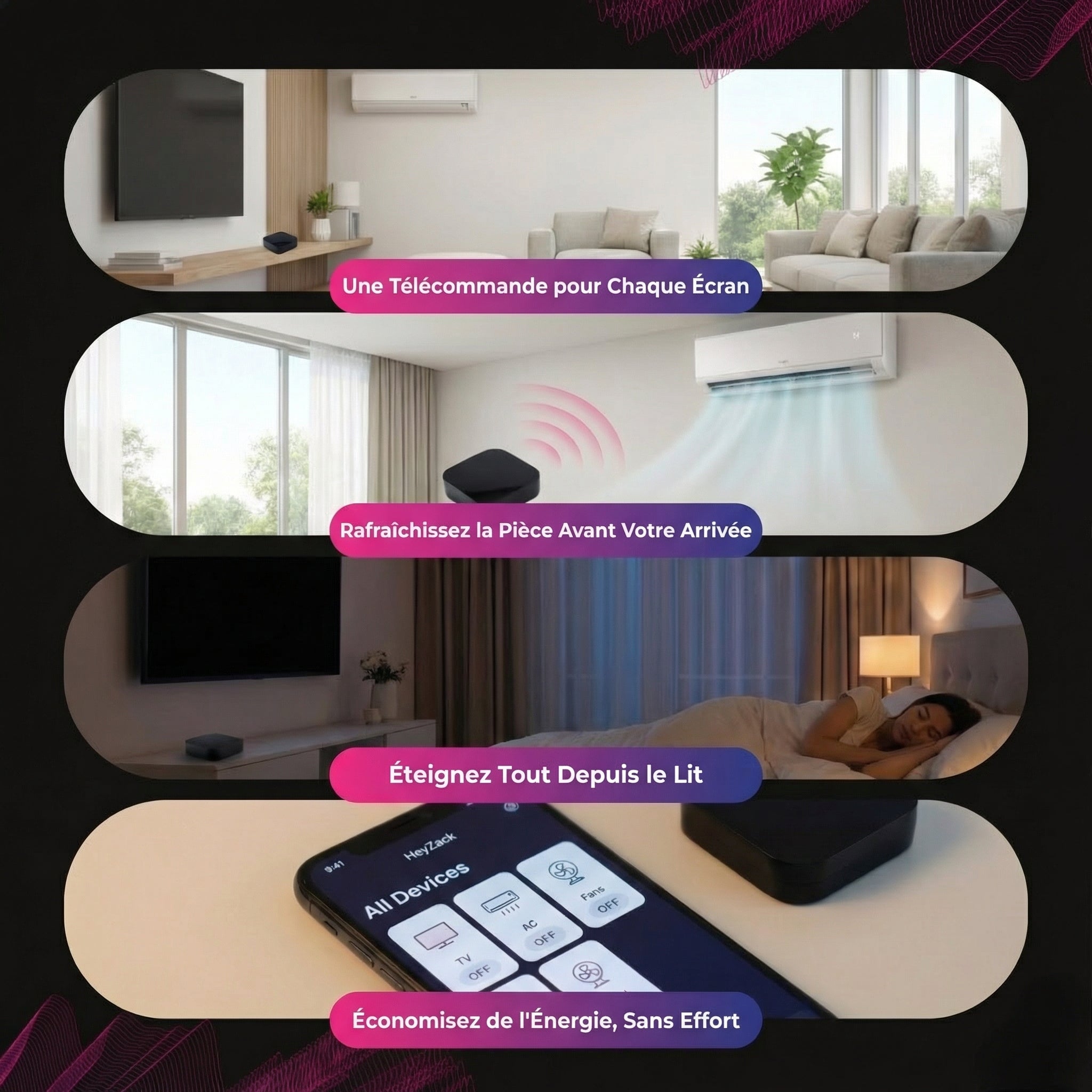 Contrôlez l'éclairage, les serrures, la climatisation et les scénarios depuis n'importe où grâce à l'application HeyZack Smart Control — gratuite sur iOS et Android.