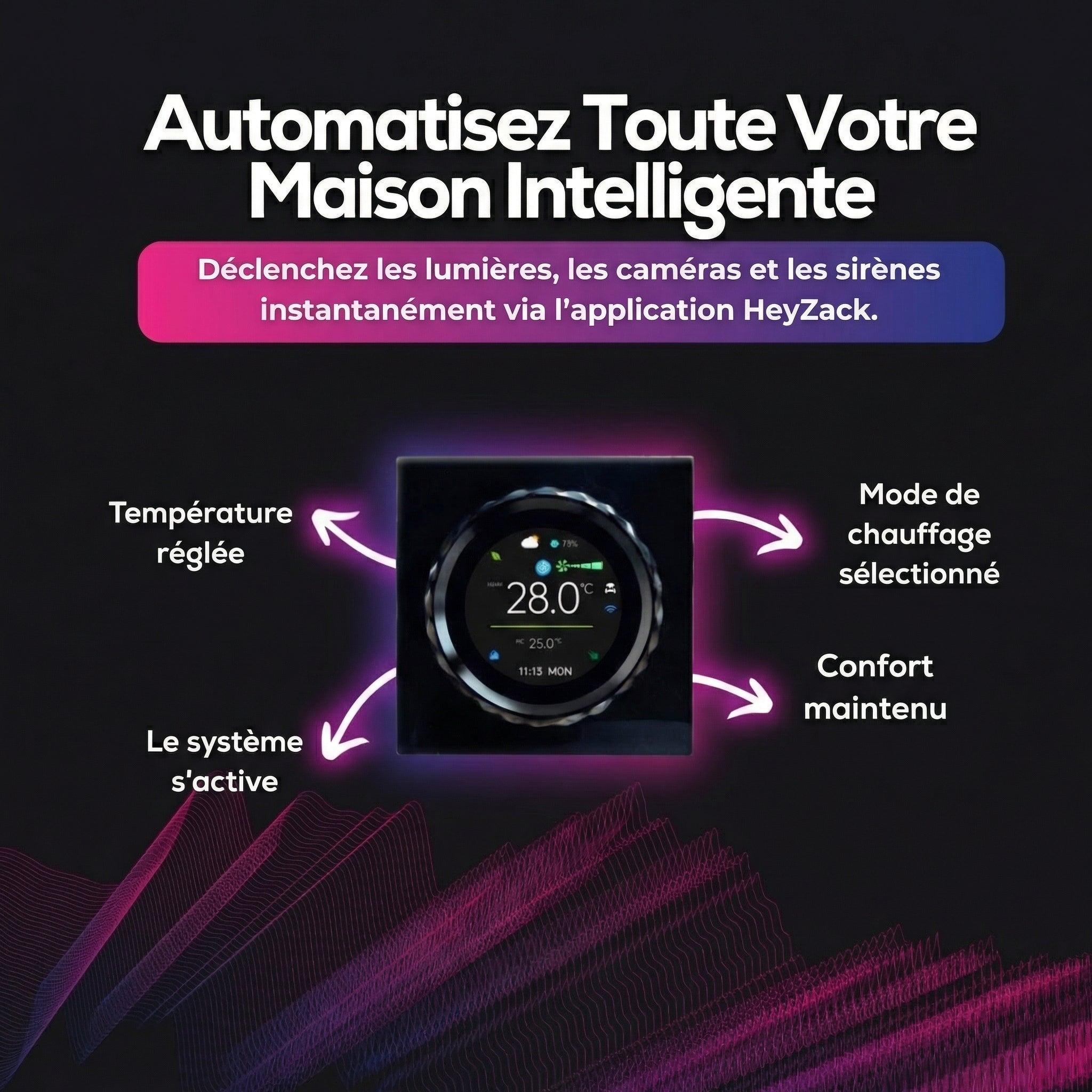 Contrôlez l'éclairage, les serrures, la climatisation et les scénarios depuis n'importe où grâce à l'application HeyZack Smart Control — gratuite sur iOS et Android.