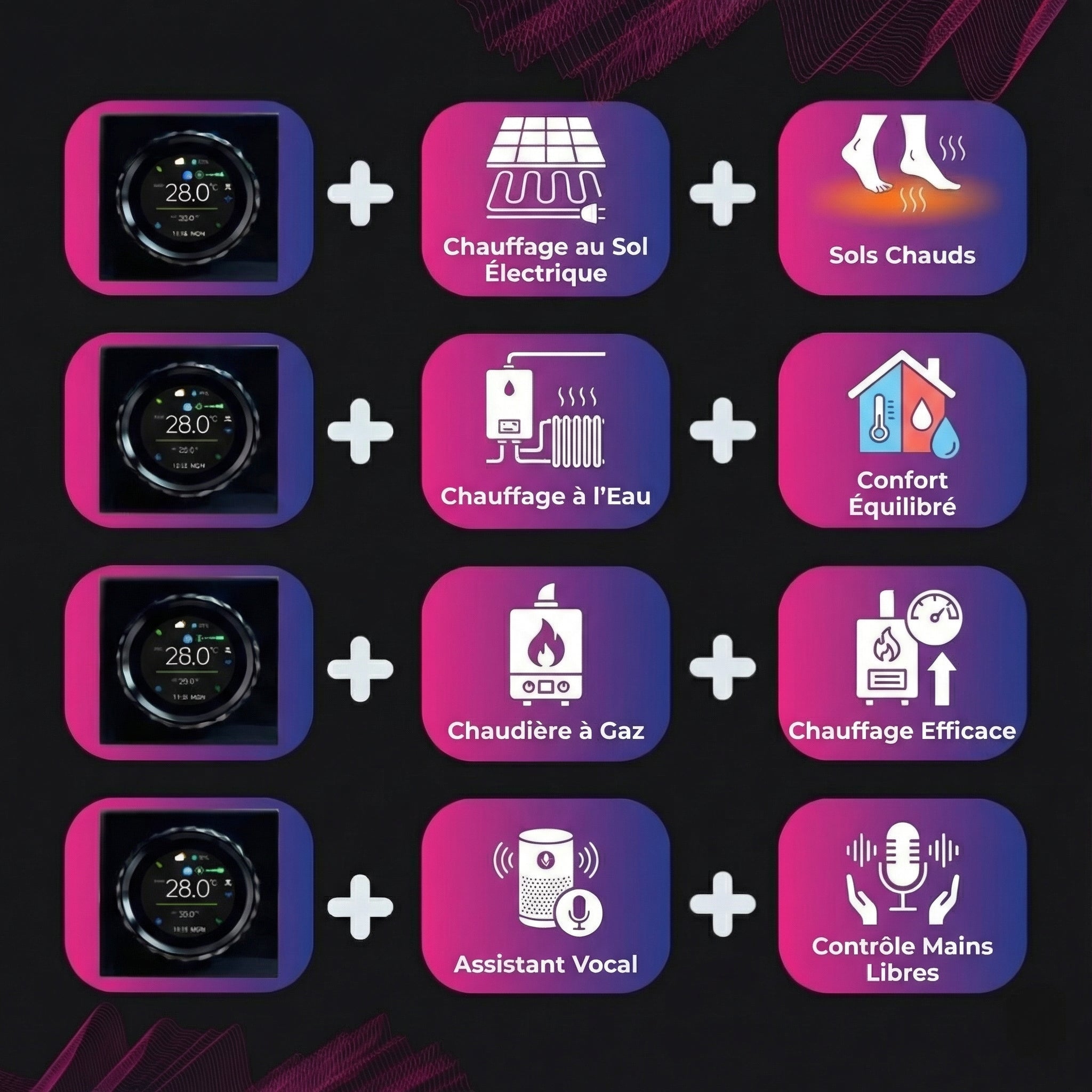 Connectez-vous sans effort aux enceintes intelligentes, aux assistants vocaux, aux écrans intelligents et aux appareils mobiles pour un contrôle de la température mains libres.